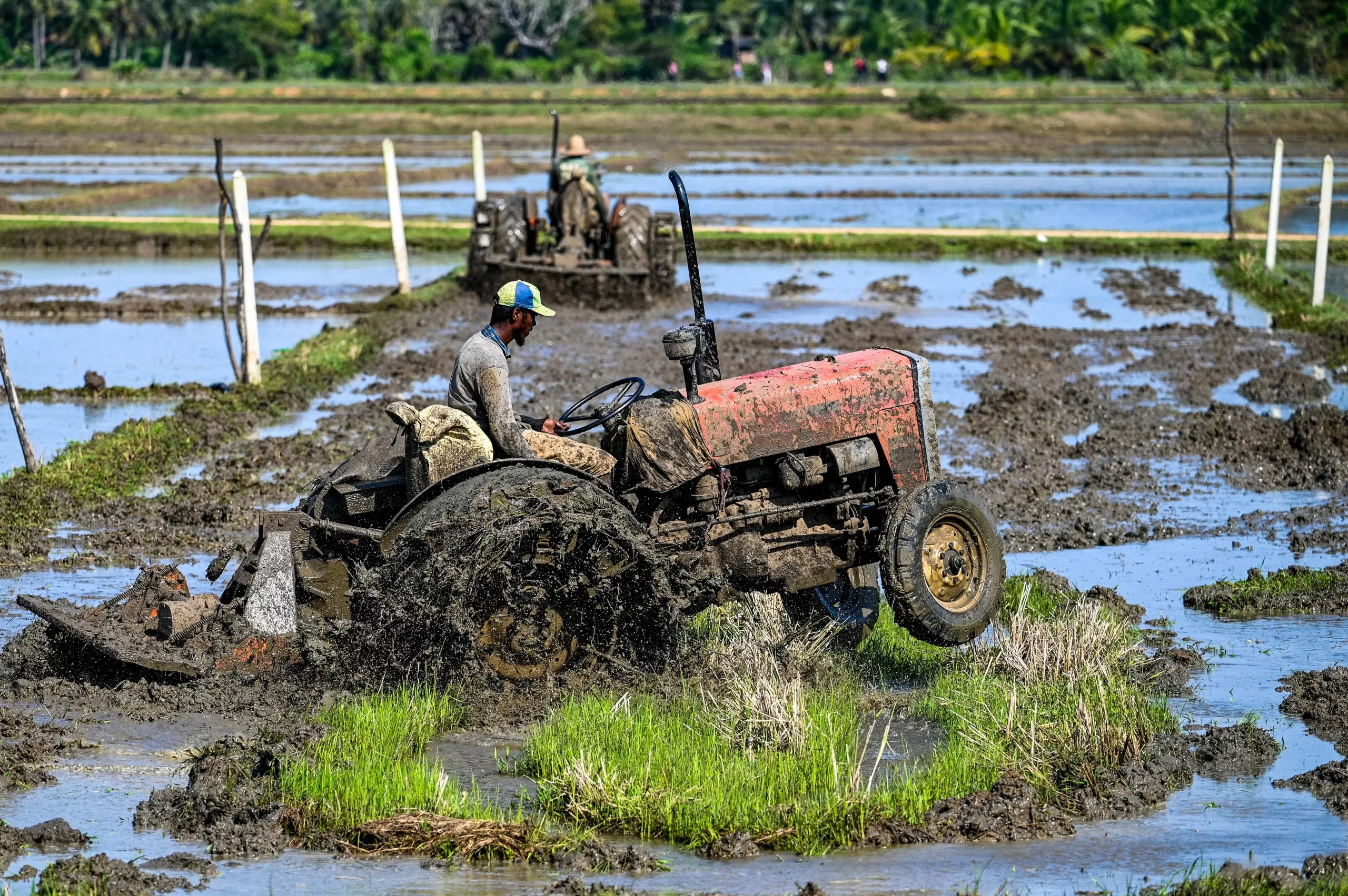Zemědělci orají rýžové pole v Trincomalee na Srí Lance 15. dubna 2025. Ishara S. Kodikara/AFP via Getty Images