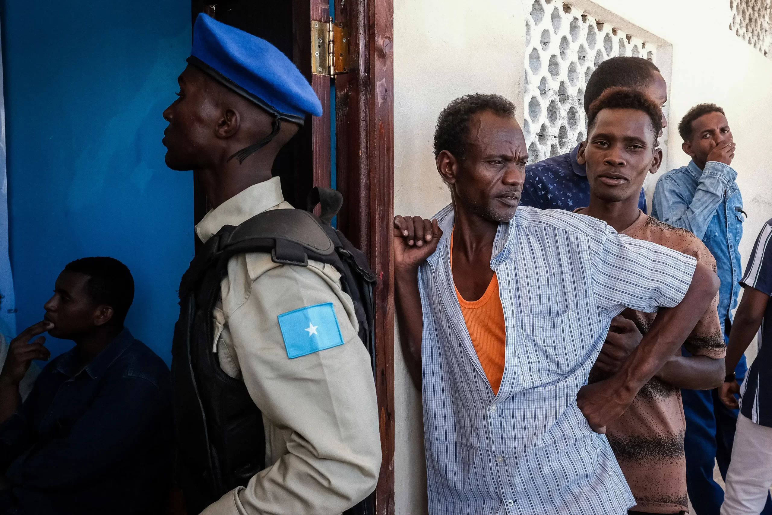 Somálský bezpečnostní důstojník dohlíží na vstup, když muži stojí ve frontě na registraci voličů v somálském Mogadišu 15. dubna 2025. Somálsko 15. dubna poprvé po více než 50 letech zahájilo v hlavním městě Mogadišu registraci voličů před prezidentskými volbami plánovanými na rok 2026. Hassan Ali Elmi/AFP via Getty Images