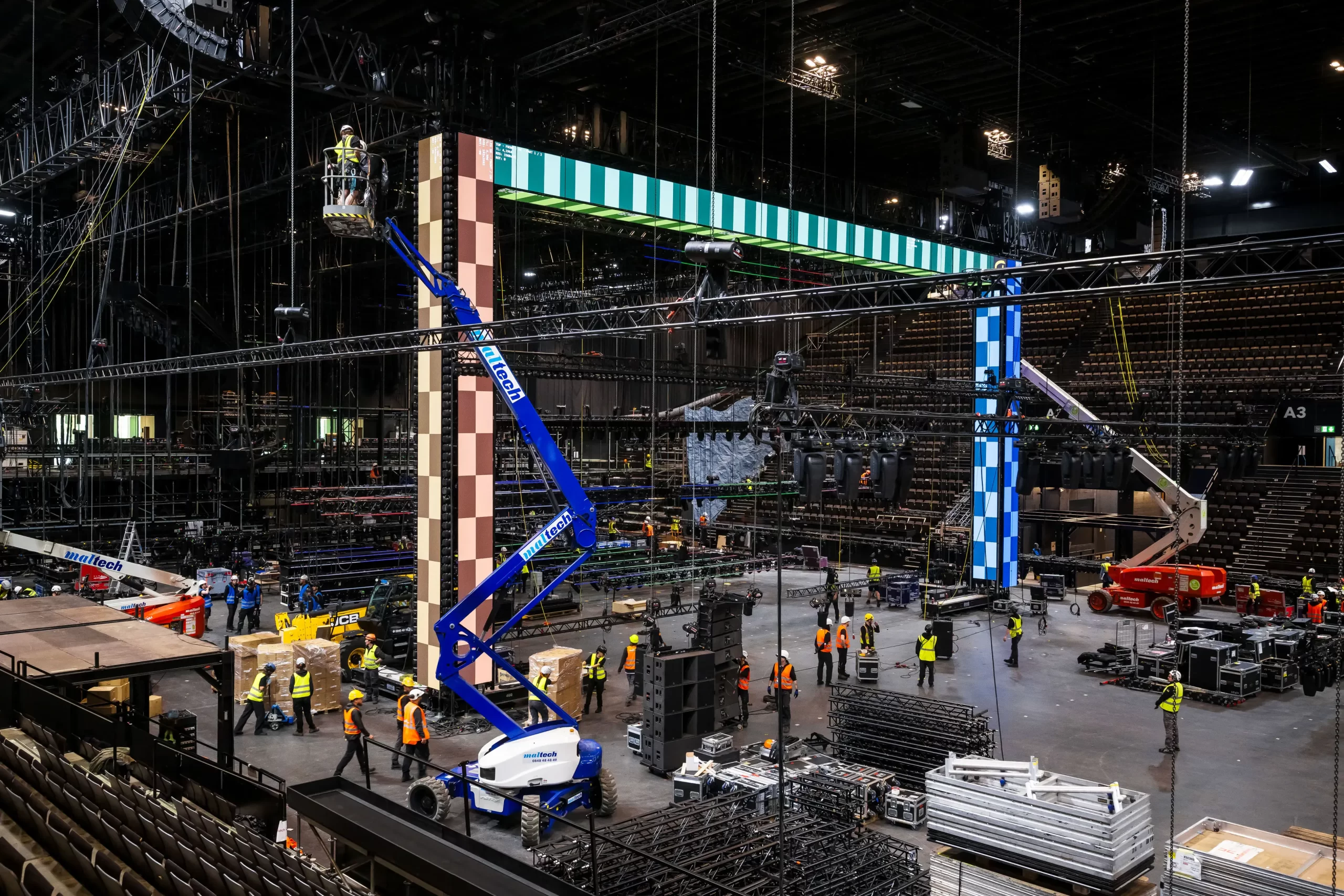 Zaměstnanci pracují pod jedním z prvků jeviště během návštěvy novinářů ve víceúčelové kryté aréně St. Jakobshalle, která bude hostit soutěž Eurovision Song Contest v roce 2025, v Basileji ve Švýcarsku 15. dubna 2025. Fabrice Coffrini/AFP via Getty Images