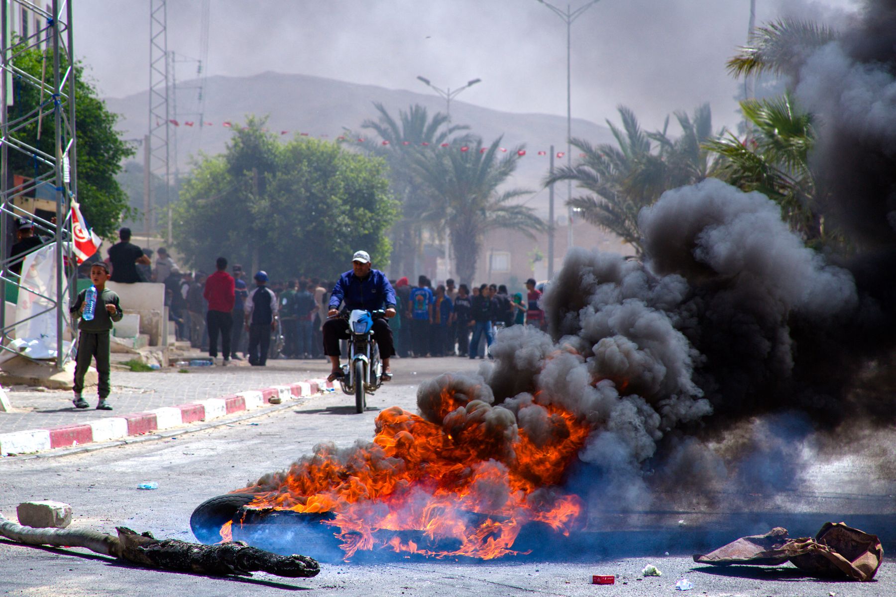 Tunisané pálí pneumatiky a blokují silnici ve městě Mazouna v tuniském regionu Sidi Bouzid 15. dubna 2025. Stovky Tunisanů protestovaly v tomto malém městě v centru země poté, co se zřítila zeď školy a zahynuli tři středoškoláci. Saber Sboui/AFP via Getty Images