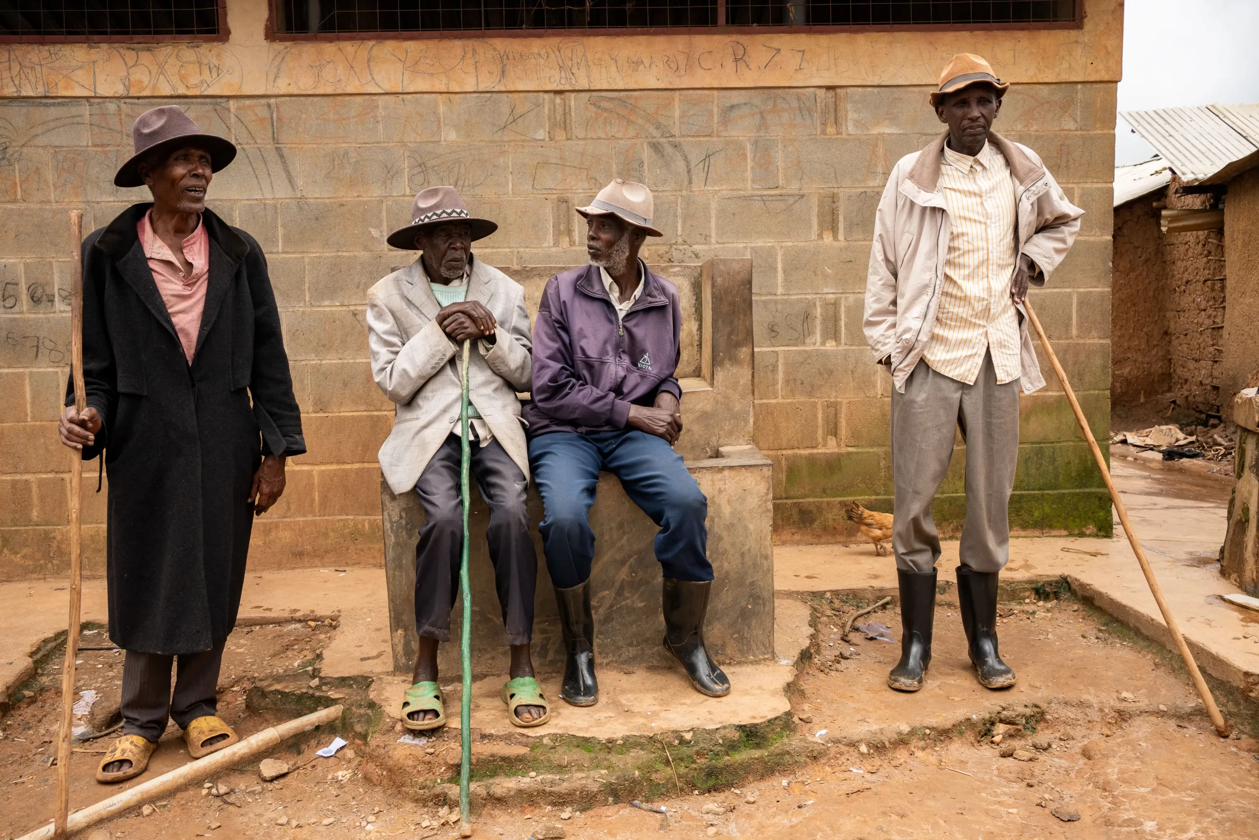 Starší muži se shromažďují poblíž trhu v uprchlickém táboře Kiziba v Karongi v Demokratické republice Kongo 14. dubna 2025. Tábor, který vznikl na začátku první konžské války (1996-1997), hostí téměř 15 000 uprchlíků, převážně Konžanů, kteří utíkají před nestabilitou ve východní části Demokratické republiky Kongo (DRK). Paloma Laudet/AFP via Getty Images