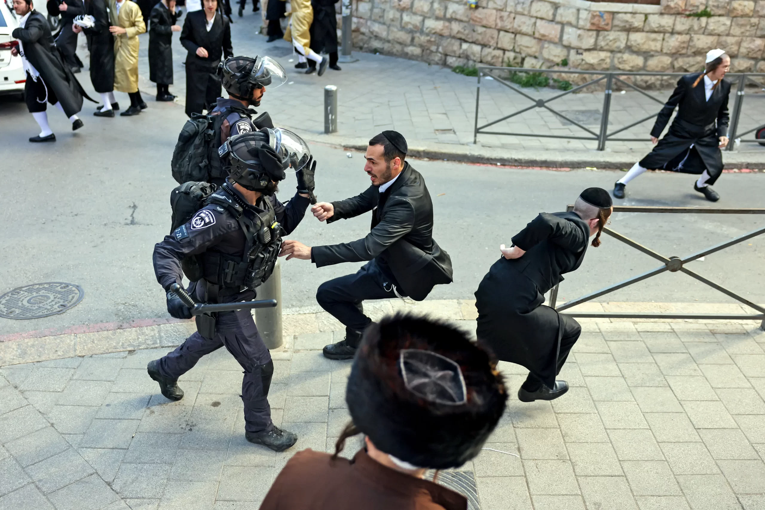 Izraelská policie rozhání ultraortodoxní židovské muže a mladíky, kteří protestují proti rozhodnutí nejvyššího izraelského soudu, že musí být odvedeni do vojenské služby, v jeruzalémské čtvrti Mea Šearim 15. dubna 2025. Ahmad Gharabli/AFP via Getty Images