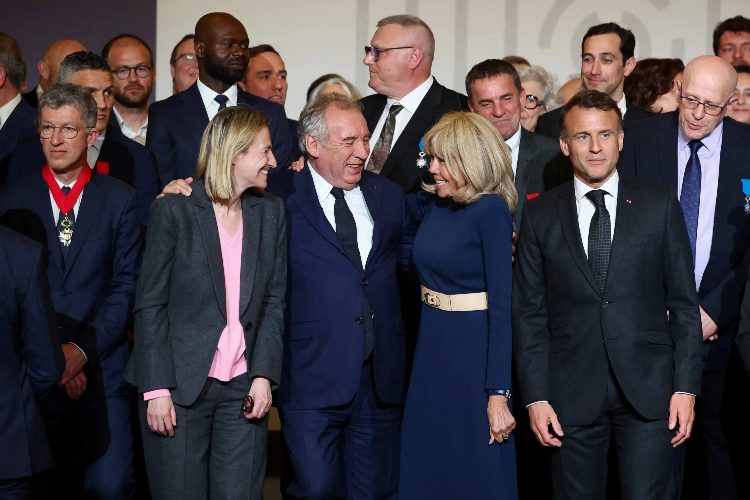 (zleva doprava) Vedoucí projektu obnovy katedrály Notre Dame de Paris Philippe Jost, francouzská ministryně práce a zaměstnanosti Astrid Panosyan-Bouvetová, francouzský premiér Francois Bayrou, francouzská první dáma Brigitte Macronová a francouzský prezident Emmanuel Macron pózují s řemeslníky a úředníky, kteří se podíleli na obnově katedrály, během slavnostního předávání cen v Elysejském paláci v Paříži 15. dubna 2025. Sarah Meyssonnier/POOL/AFP via Getty Images