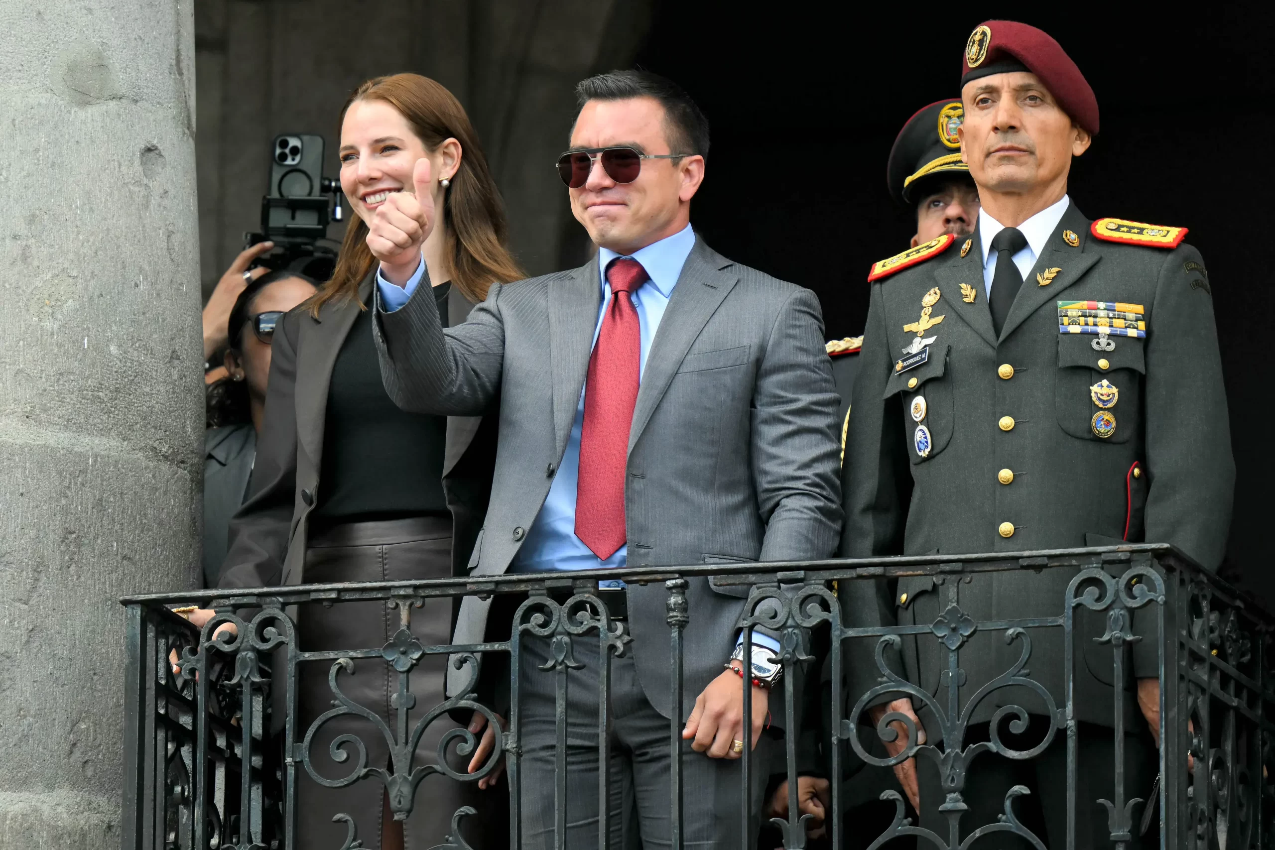 Zvolený ekvádorský prezident Daniel Noboa v doprovodu své manželky Lavinie Valbonesiové ukazuje palec nahoru svým příznivcům z balkonu prezidentského paláce Carondelet při slavnostním střídání stráží v Quitu 15. dubna 2025. Rodrigo Buendia/AFP via Getty Images