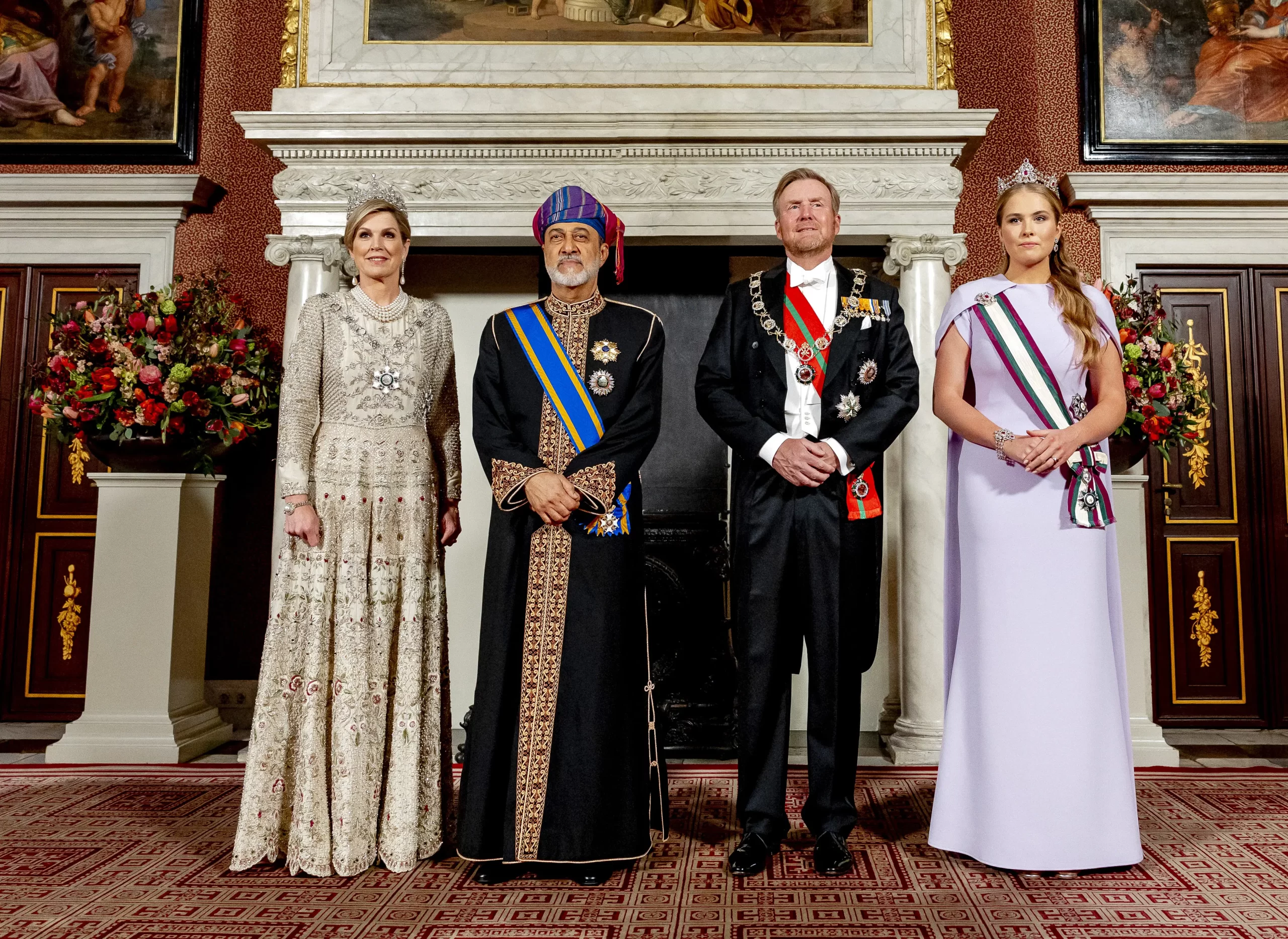 Nizozemský král Willem-Alexander (2. zprava) a královna Maxima (zleva) pózují s princeznou Amálií (zprava) a ománským sultánem Haithamem bin Tarikem před státním banketem v královském paláci v nizozemském Amsterdamu 15. dubna 2025. Ománský sultán je na dvoudenní státní návštěvě Nizozemska. Remko De Waal/ANP/AFP via Getty Images