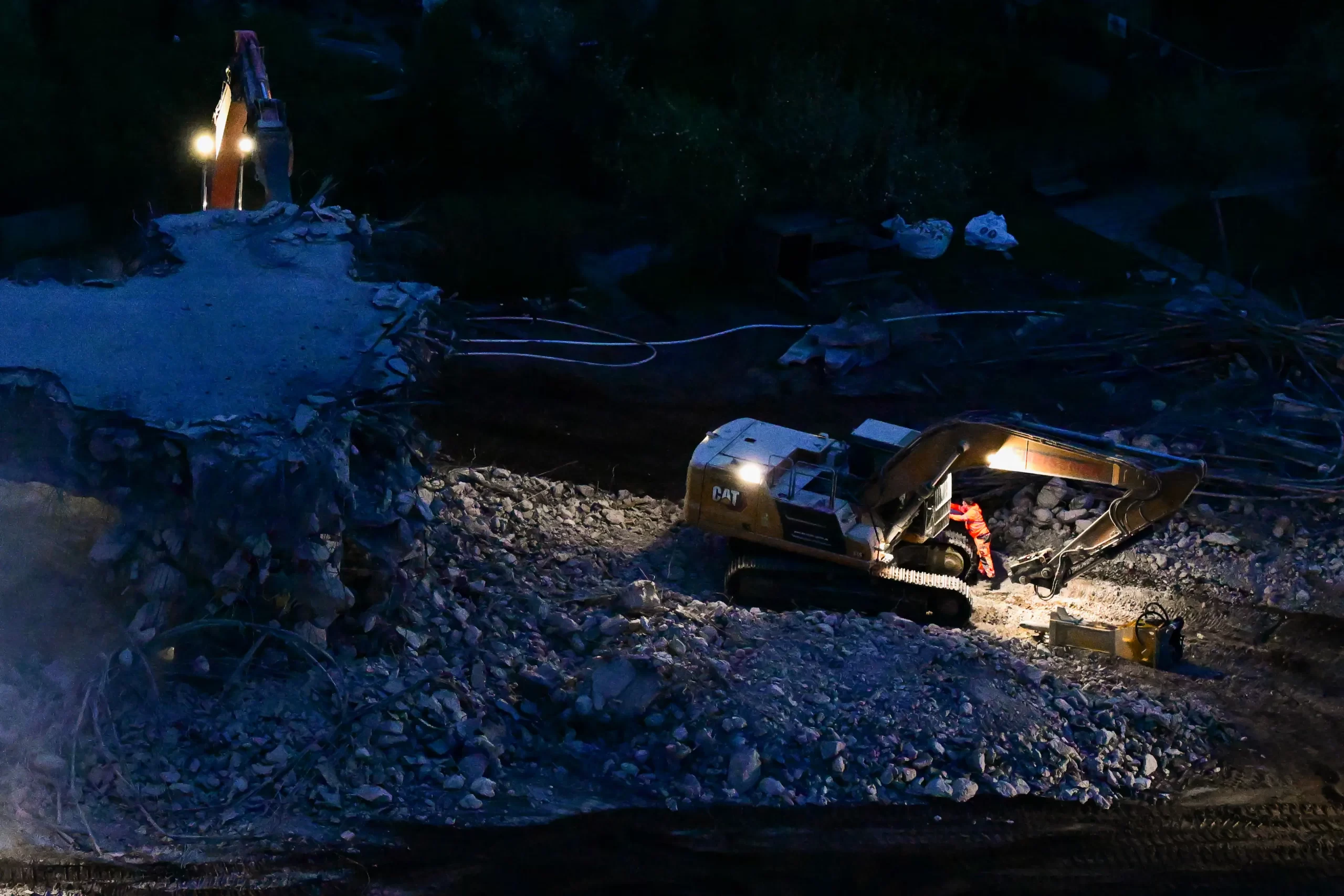 Bagry provádějí demoliční práce na mostě „Ringbahn“ dálnice A100 v berlínské čtvrti Charlottenburg při pohledu z vyhlídkové plošiny věže Funkturm v Berlíně 15. dubna 2025. Most postavený v roce 1963 byl v polovině března po statickém průzkumu uzavřen kvůli nebezpečí zřícení. Tobias Schwarz/AFP via Getty Images
