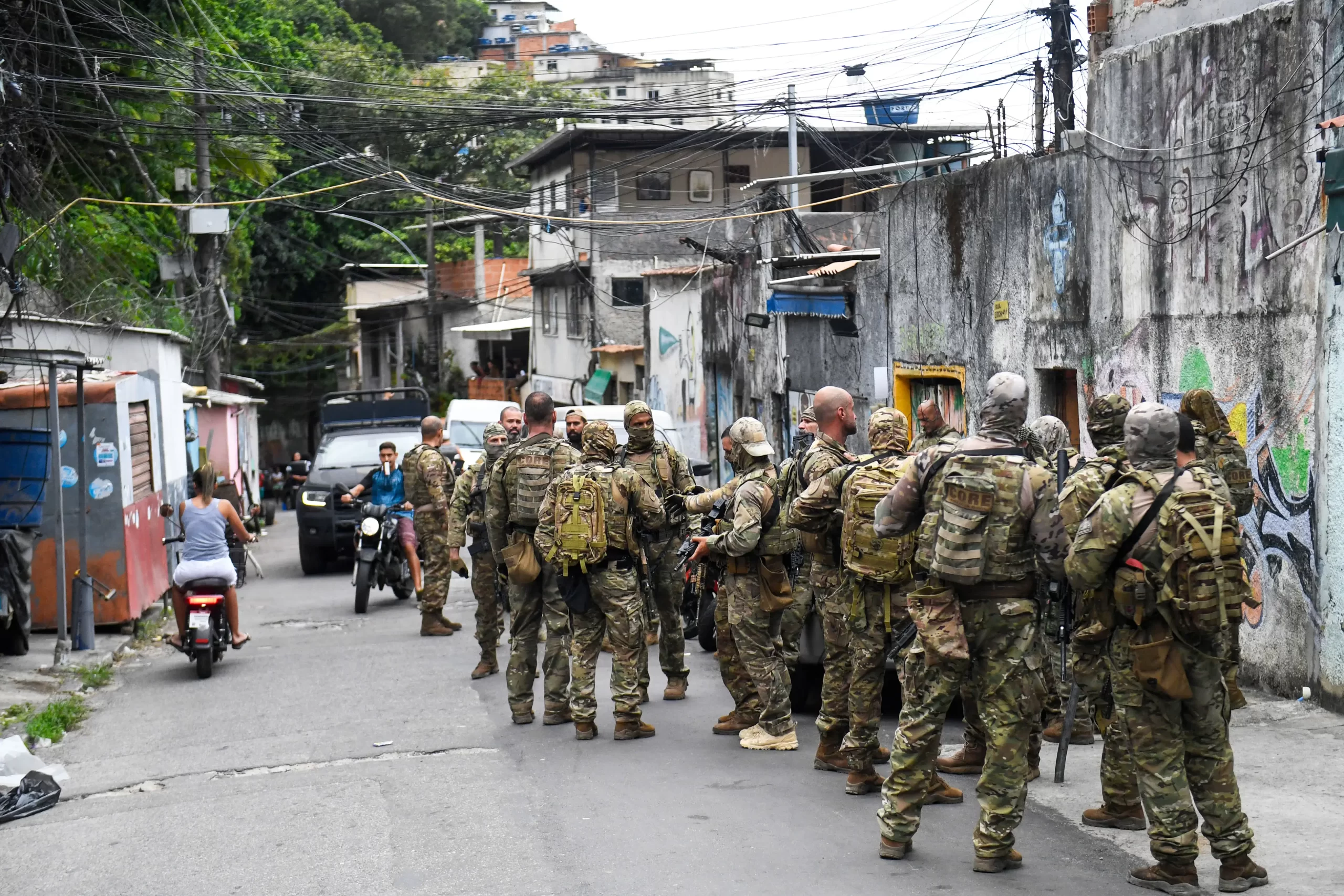 Agenti speciálních policejních jednotek se účastní operace ve slumu Tabajara v Copacabaně v brazilském Riu de Janeiru 15. dubna 2025. Podle úředníků při operaci, jejímž cílem bylo dopadnout vrahy 38letého civilního policisty João Pedra Marquiniho, manžela Tuly Mello, soudkyně brazilského trestního soudu, zemřelo pět podezřelých. Daniel Ramalho/AFP via Getty Images