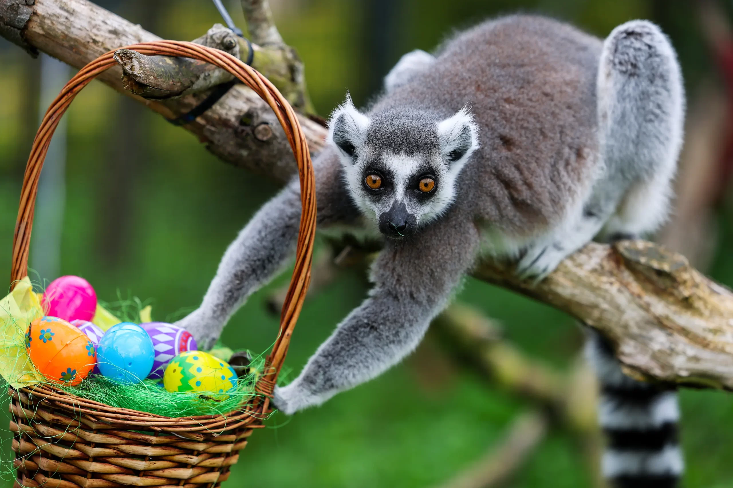 Lemur kata si před velikonočním víkendem pochutnává na pamlsku ve skotském Edinburghu 15. dubna 2025. Zoo Five Sisters u Edinburghu je domovem více než 160 různých druhů zvířat z celého světa, včetně zachráněných zvířat. Jeff J Mitchell/Getty Images