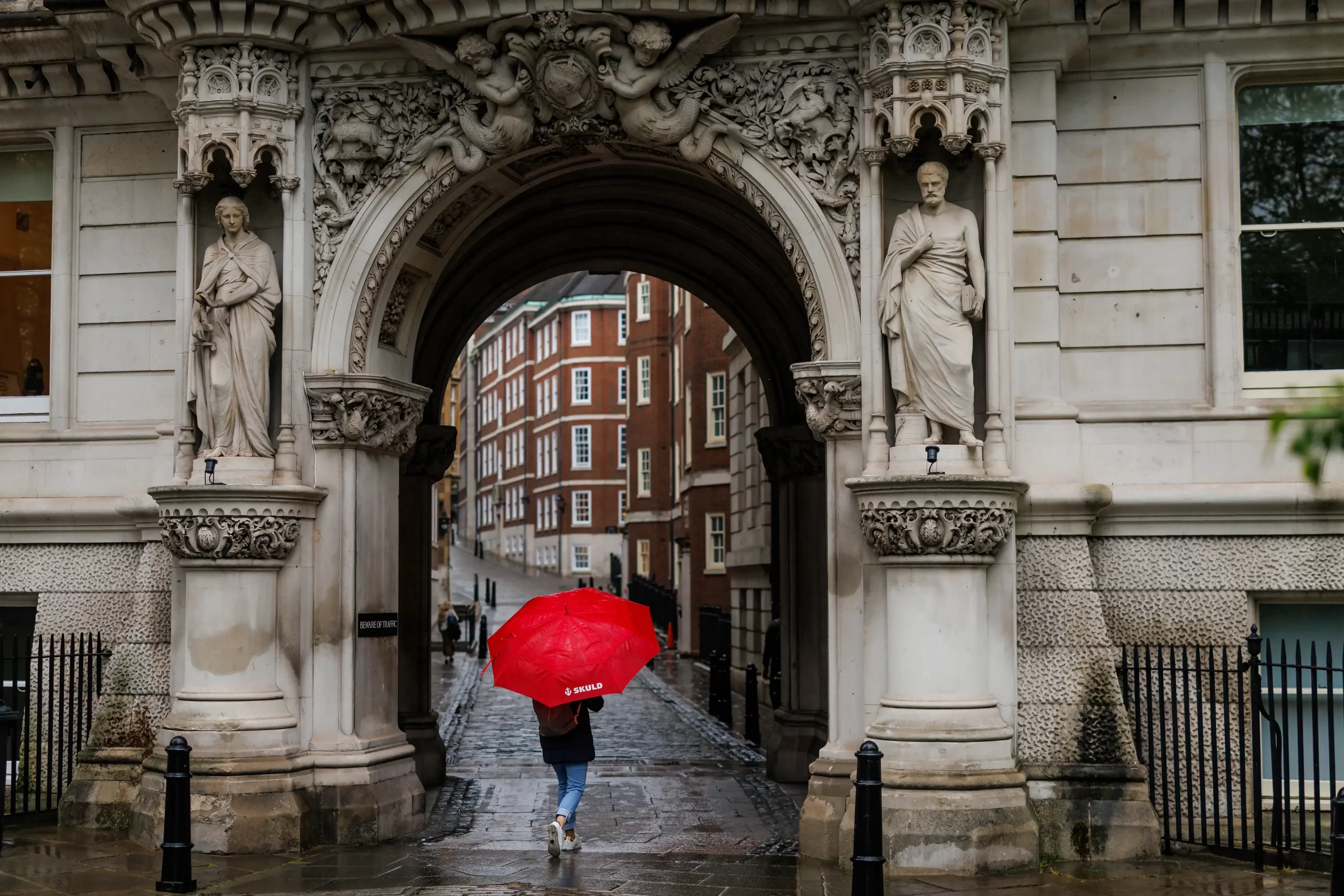 Zástupce veřejnosti prochází v dešti po Middle Temple v Londýně 15. dubna 2025. Dan Kitwood/Getty Images