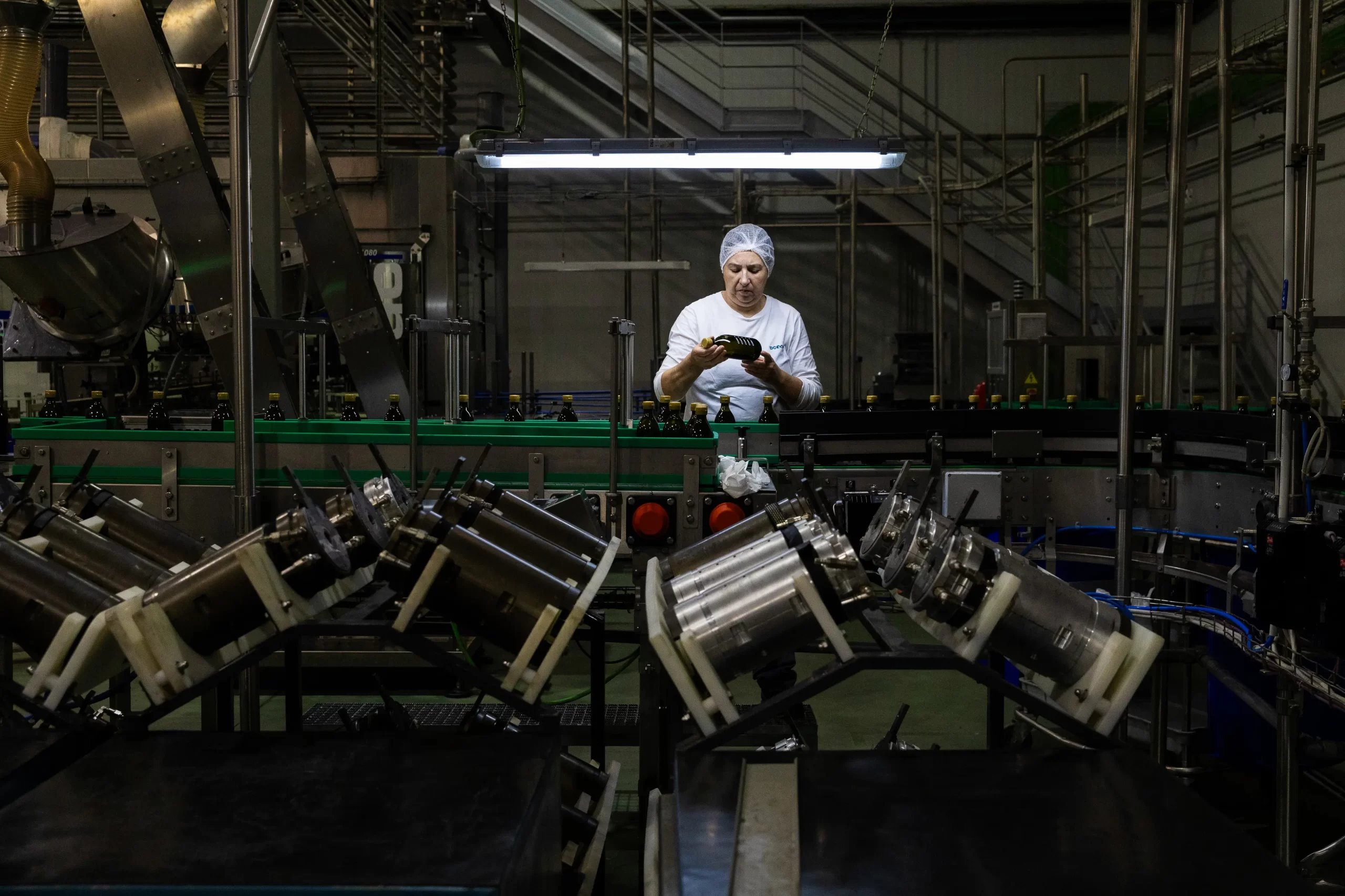 Zaměstnanec kontroluje lahve v balírně olivového oleje ve španělské Antequerě 15. dubna 2025. Pablo Blazquez Dominguez/Getty Images