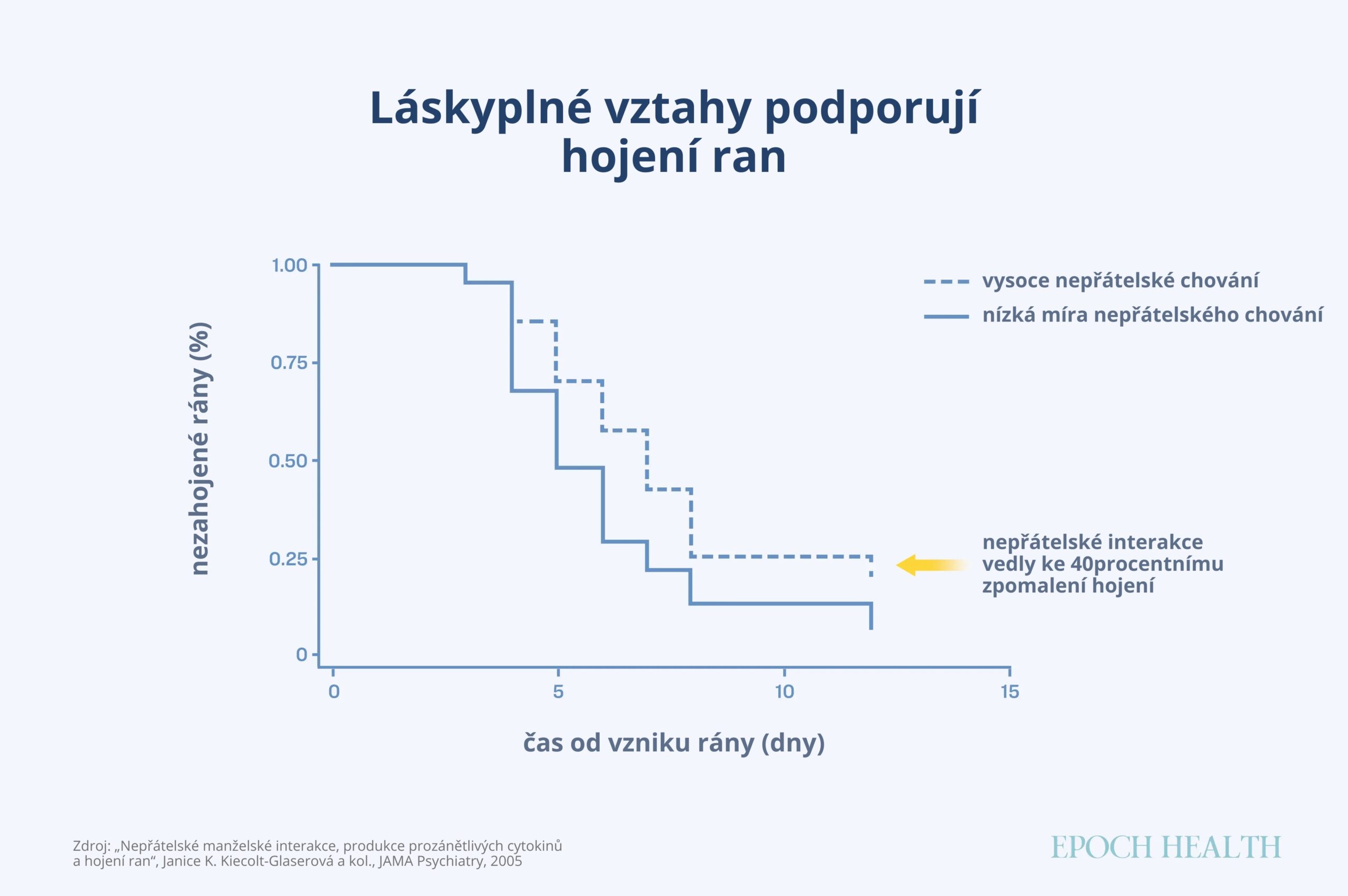 Studie naznačuje, že pozitivní emoční stavy vyvolané milujícími vztahy aktivují parasympatický nervový systém, známý také jako „odpočinkový a trávicí“ systém, který snižuje záněty a urychluje opravu buněk. Naopak nepřátelské vztahy hojení brzdily až o 60 procent, pravděpodobně kvůli zvýšené hladině stresových hormonů, jako je kortizol.