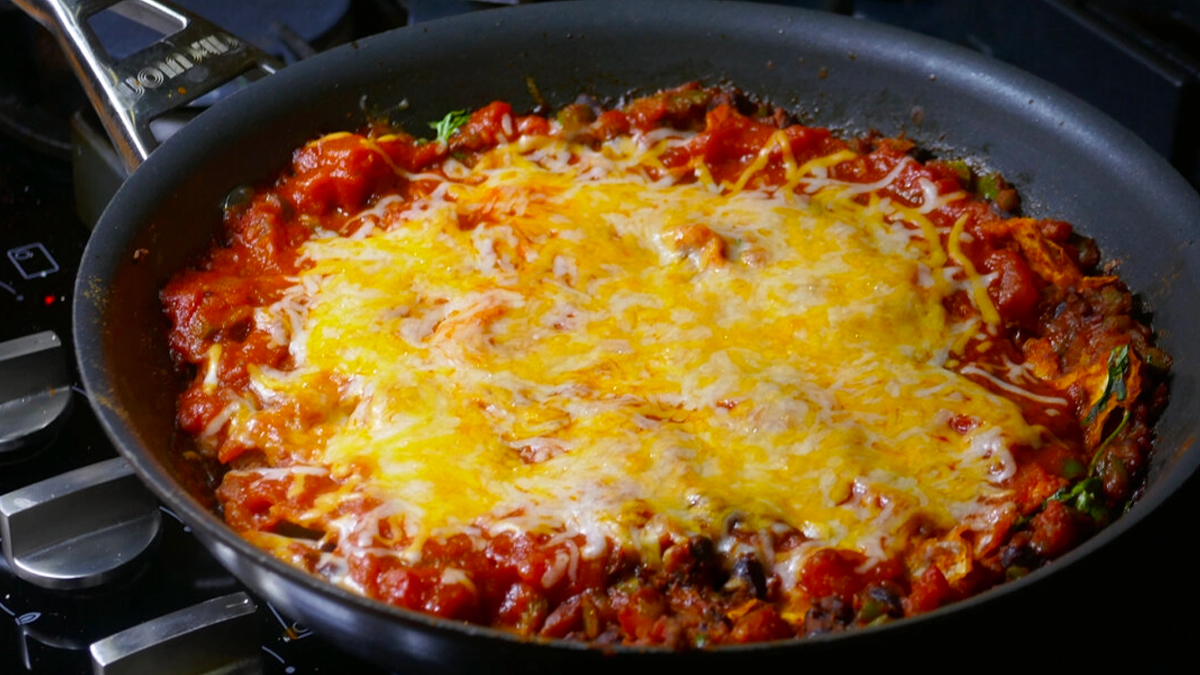 Tento jednoduchý vegetariánský recept na enchilady připravíte v jediné pánvi a za pouhých 15 minut – bez nutnosti rolování! Přípravu můžete ještě zkrátit použitím již nakrájené cibule a zelené papriky z chladicího pultu. Křupavé kousky opečených kukuřičných tortill dodají pokrmu zajímavou texturu.