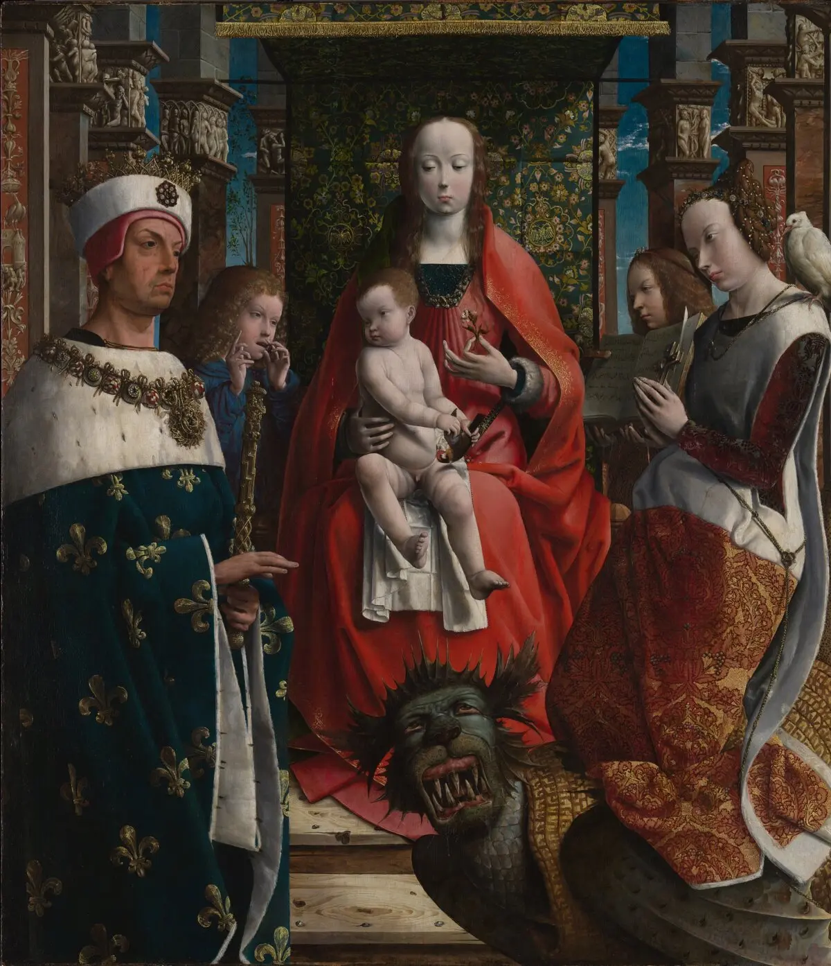Malíř zobrazil otevřenou kapli pod širým nebem, v níž po stranách trůnící Panny Marie s Ježíškem stojí francouzský král sv. Ludvík, sv. Markéta a dva andělé hrající hudbu.