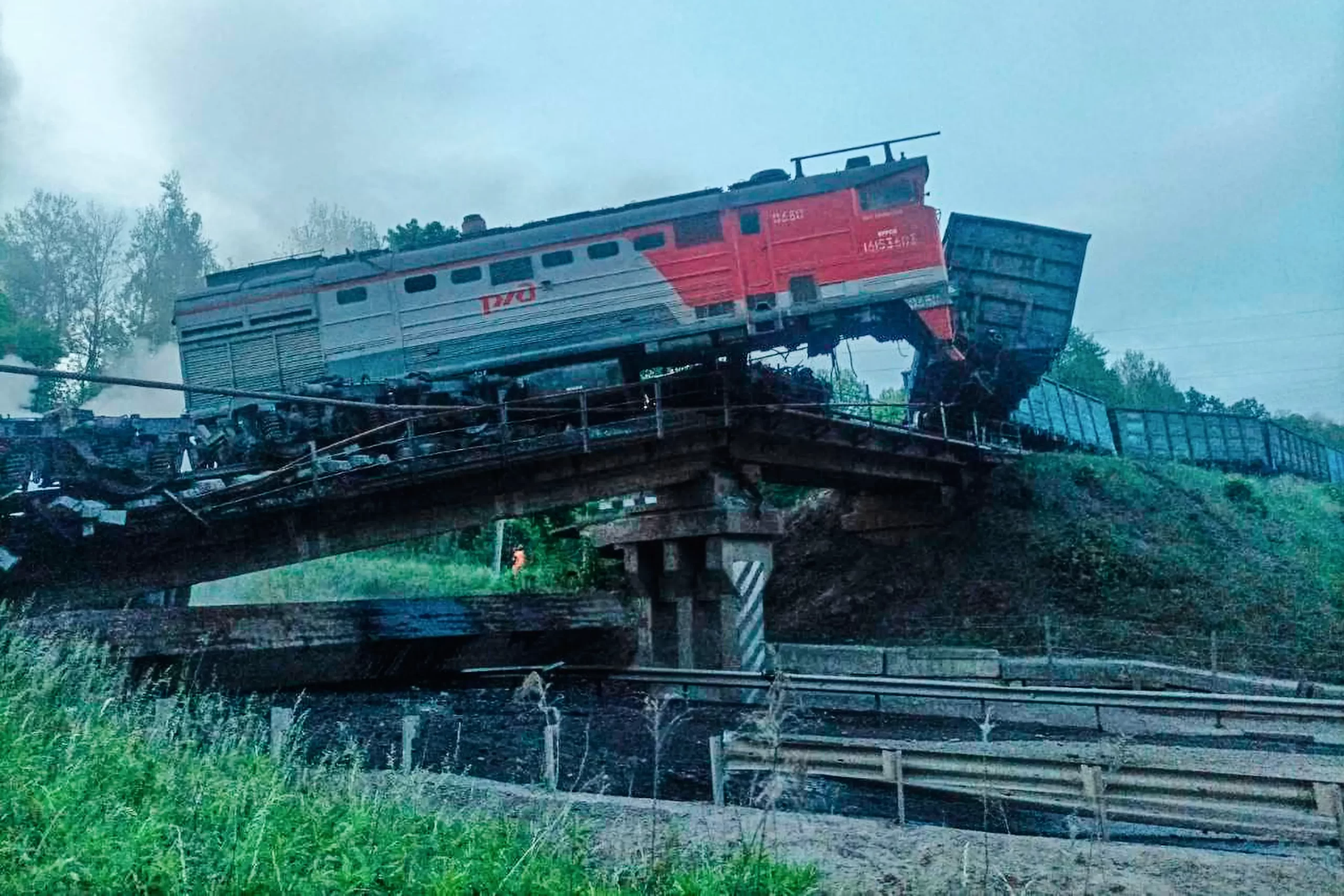 Poškozený most po havárii nákladního vlaku v ruské Kurské oblasti, která sousedí s Ukrajinou, na fotografii zveřejněné 1. června 2025. Výbuchy způsobily v noci na 1. června zřícení dvou mostů a vykolejení dvou vlaků v západním Rusku, uvedly úřady, aniž by sdělily, co bylo příčinou výbuchů. Při jednom z incidentů zahynulo sedm lidí a desítky byly zraněny. Profimedia