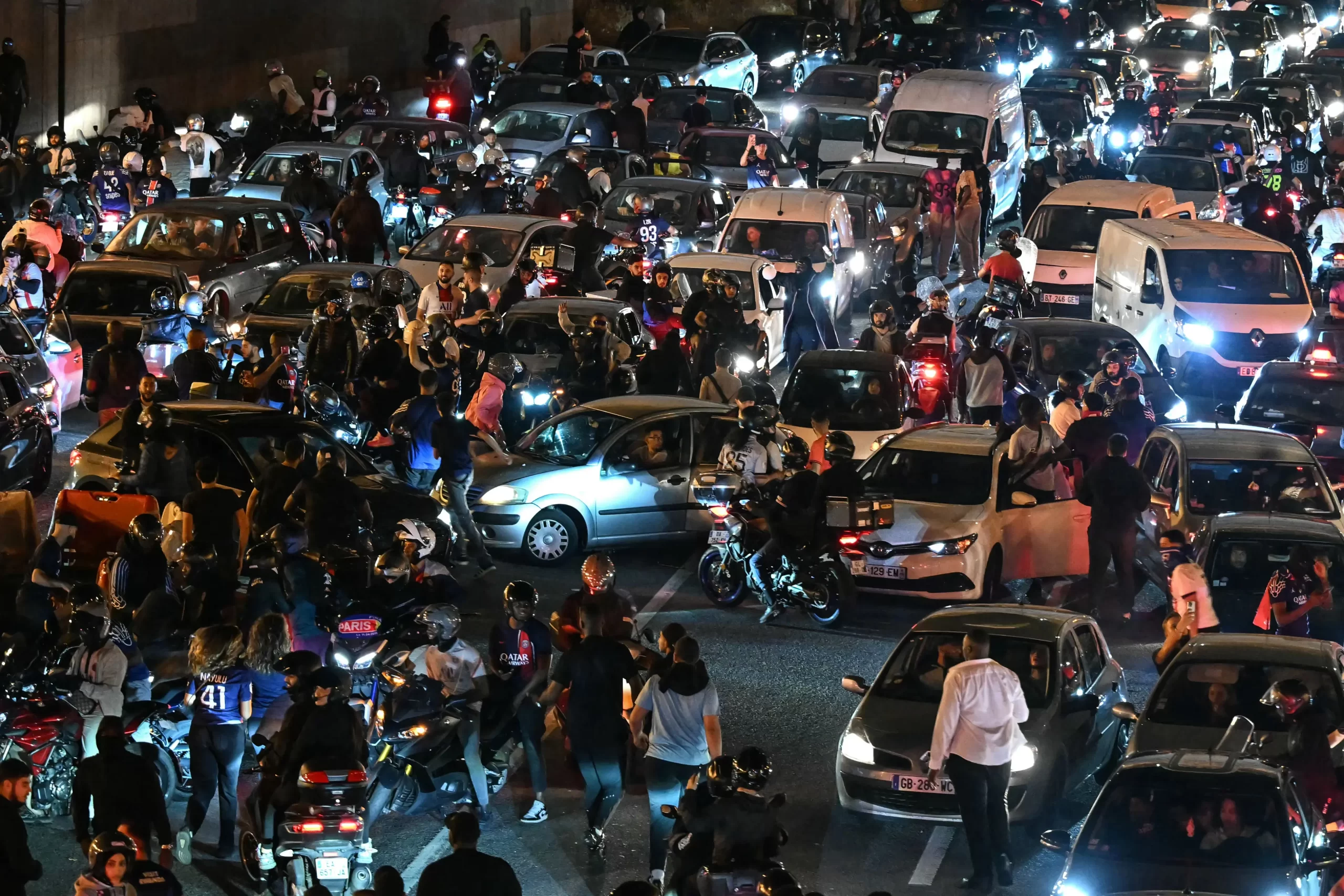 Příznivci Paris Saint-Germain (PSG) a motoristé zastavují na Peripherique mezi Porte Maillot a Porte Champerret v Paříži 1. června 2025 brzy ráno během oslav po vítězství 5:0 nad Interem Milán ve finálovém zápase fotbalové Ligy mistrů UEFA, který se konal v Mnichově. Při chaotických oslavách ve Francii po vítězství zemřeli přes noc dva lidé a stovky byly zatčeny. Lou Benoist/AFP via Getty Images