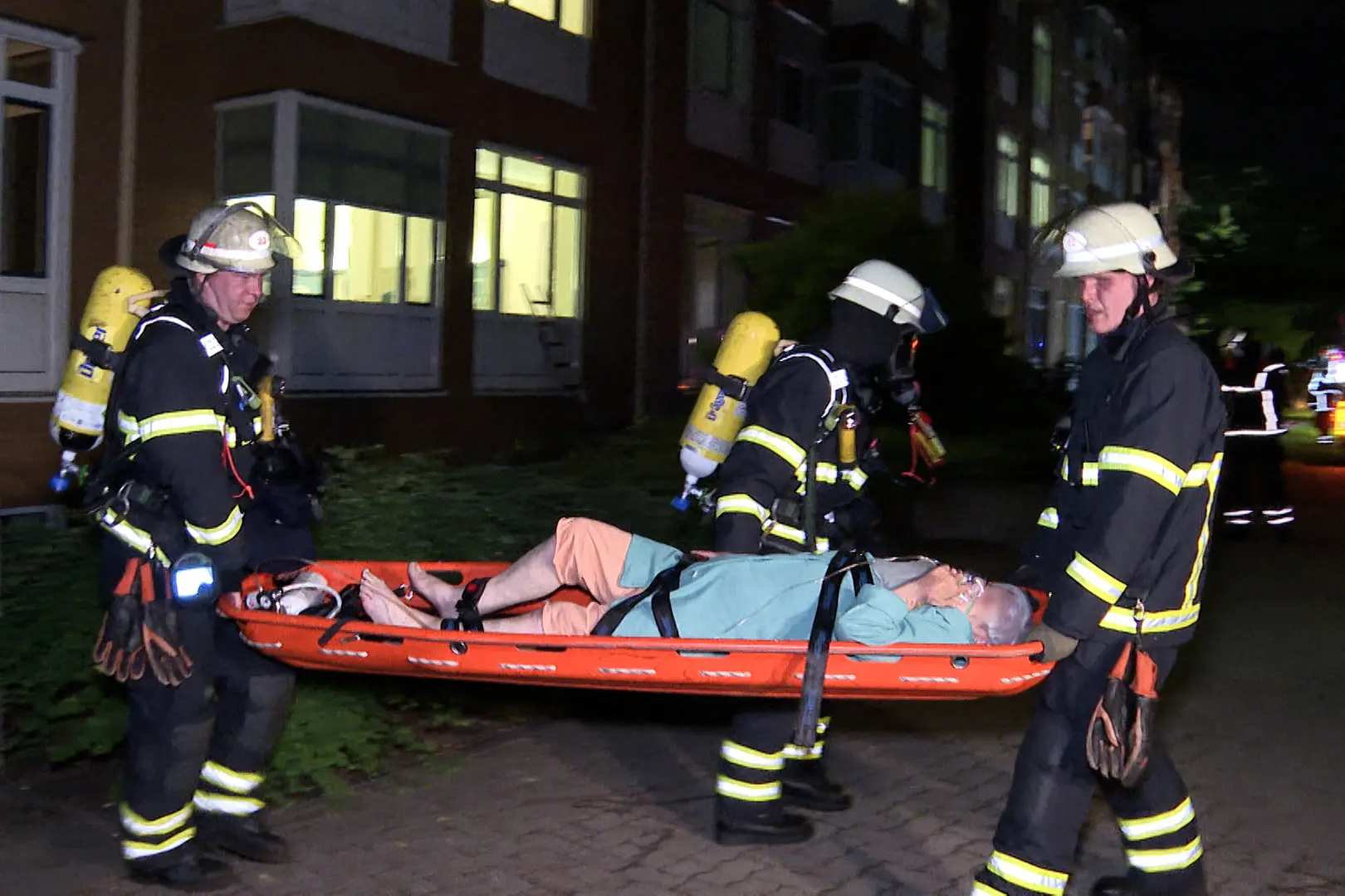 Hasiči vynášejí starší osobu z nemocnice Marienkrankenhaus v severoněmeckém Hamburku během požáru v noci z 31. května na 1. června 2025. Při nočním požáru, který vypukl v pokoji na geriatrickém oddělení nemocnice, zemřeli tři lidé a několik starších pacientů muselo být evakuováno. Fabian Hoefig/NEWS5/AFP via Getty Images