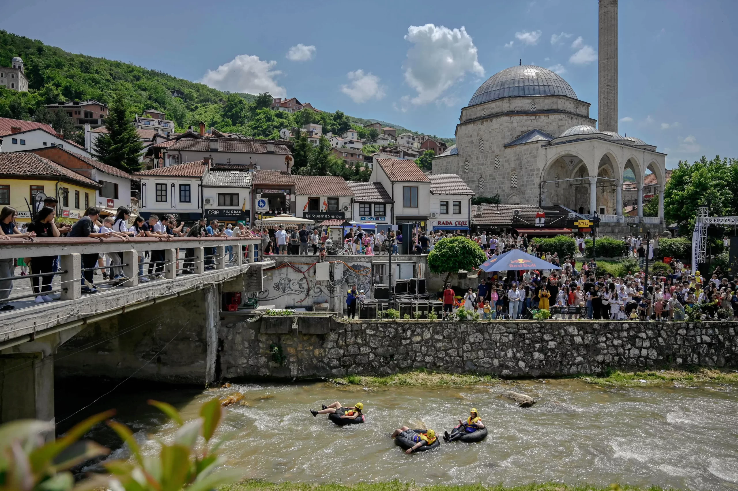 Soutěžící plují na traktorových duších po řece Bistrica během festivalu Bunar ve městě Prizren na jihu Kosova 1. června 2025. Armend Nimani/AFP via Getty Images