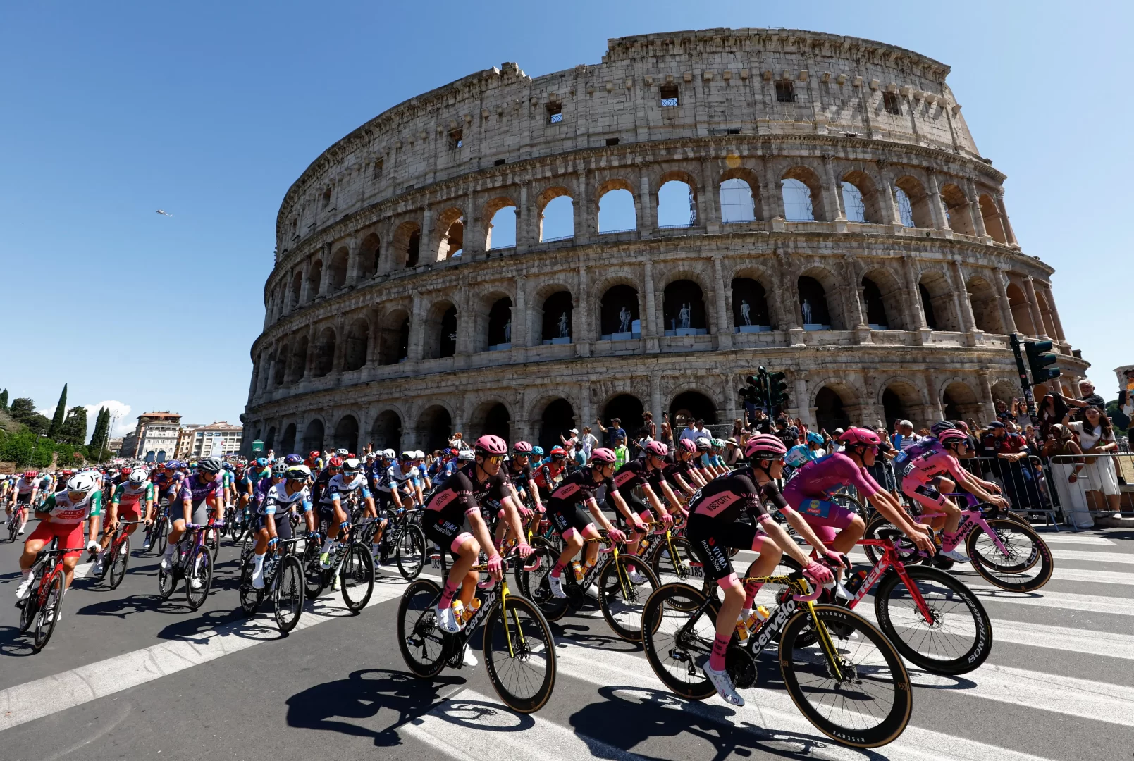 Cyklisté projíždějí kolem Kolosea během 21. etapy 108. ročníku cyklistického závodu Giro d’Italia v Římě 1. června 2025. Luca Bettini/AFP via Getty Images