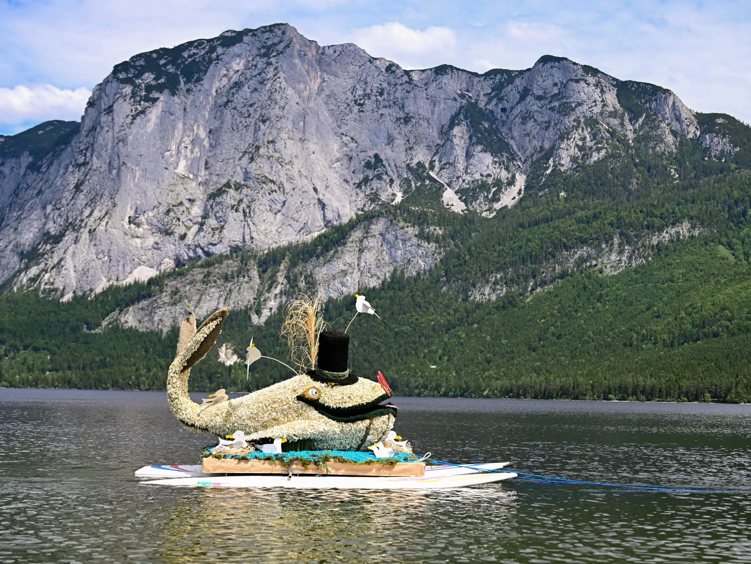 Plovák se sochou velryby s názvem „Schlau Wal“ (Chytrá velryba) z narcisů na vodě během Slavnosti narcisů (Narzissenfest) v rakouském Altaussee 1. června 2025. Barbara Gindl/APA/AFP via Getty Images