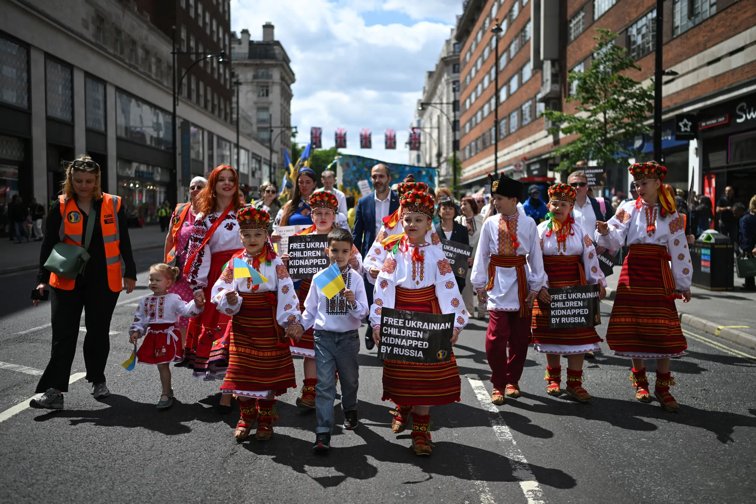 Děti v tradičních oděvech se účastní pochodu v rámci kampaně Solidarita s Ukrajinou, který požaduje, aby Rusko vrátilo ukrajinské děti, které byly poslány do Ruska nebo na území okupovaná Ruskem, v Londýně 1. června 2025. Rusko popírá nucené deportace a tvrdí, že děti byly evakuovány v zájmu jejich bezpečnosti. Justin Tallis/AFP prostřednictvím Getty Images