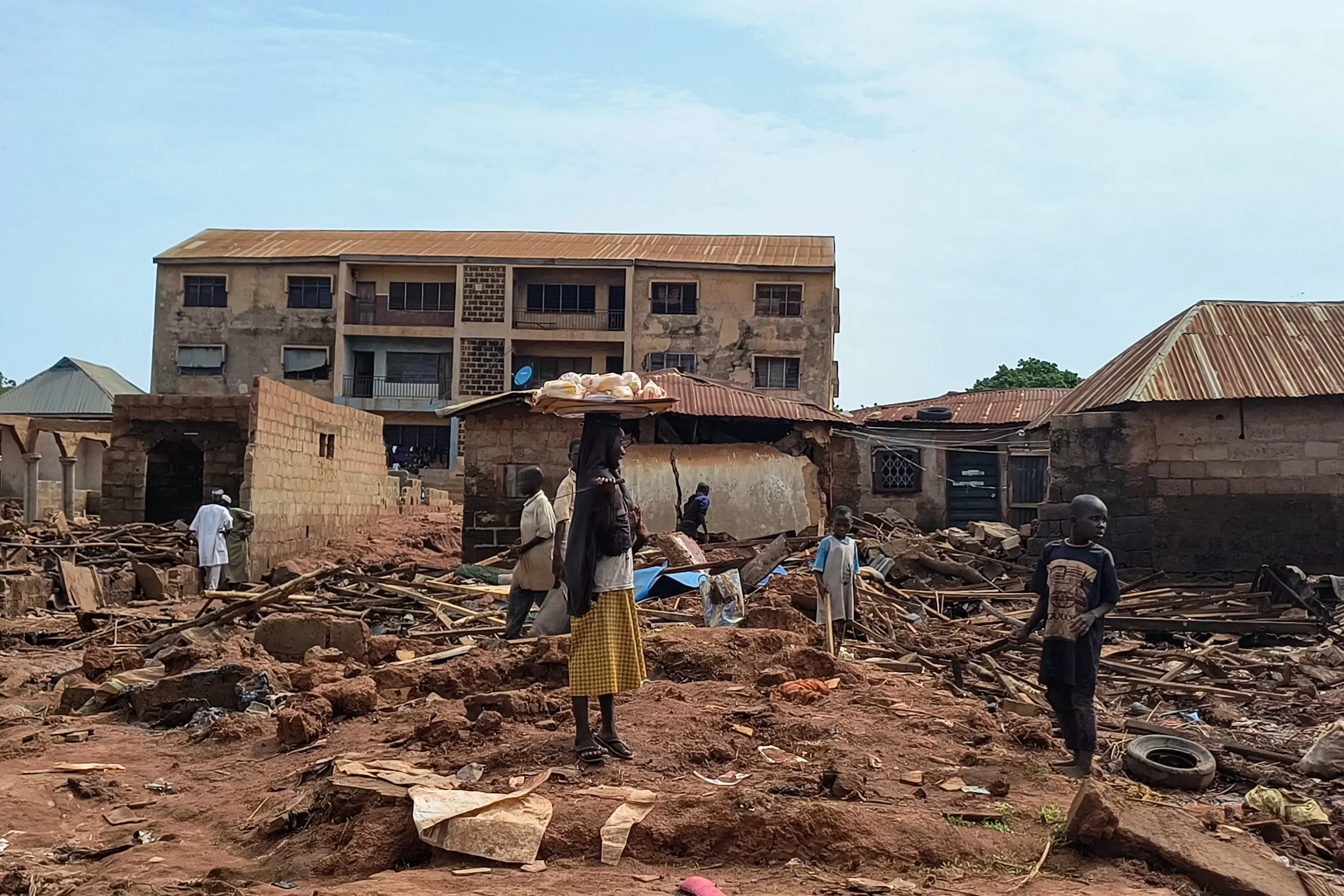 Žena stojí u trosek poškozených budov v nigerijském městě Mokwa 1. června 2025 poté, co město přes noc zasáhly přívalové deště a záplavy vyhnaly z domovů více než 3 000 lidí. Pátrací týmy se rozprostřely několik kilometrů od epicentra smrtících bleskových záplav, zatímco počet obětí prudkých dešťů v tržním městě v severní části země přesáhl 150. Tonye Bakare/AFP via Getty Images
