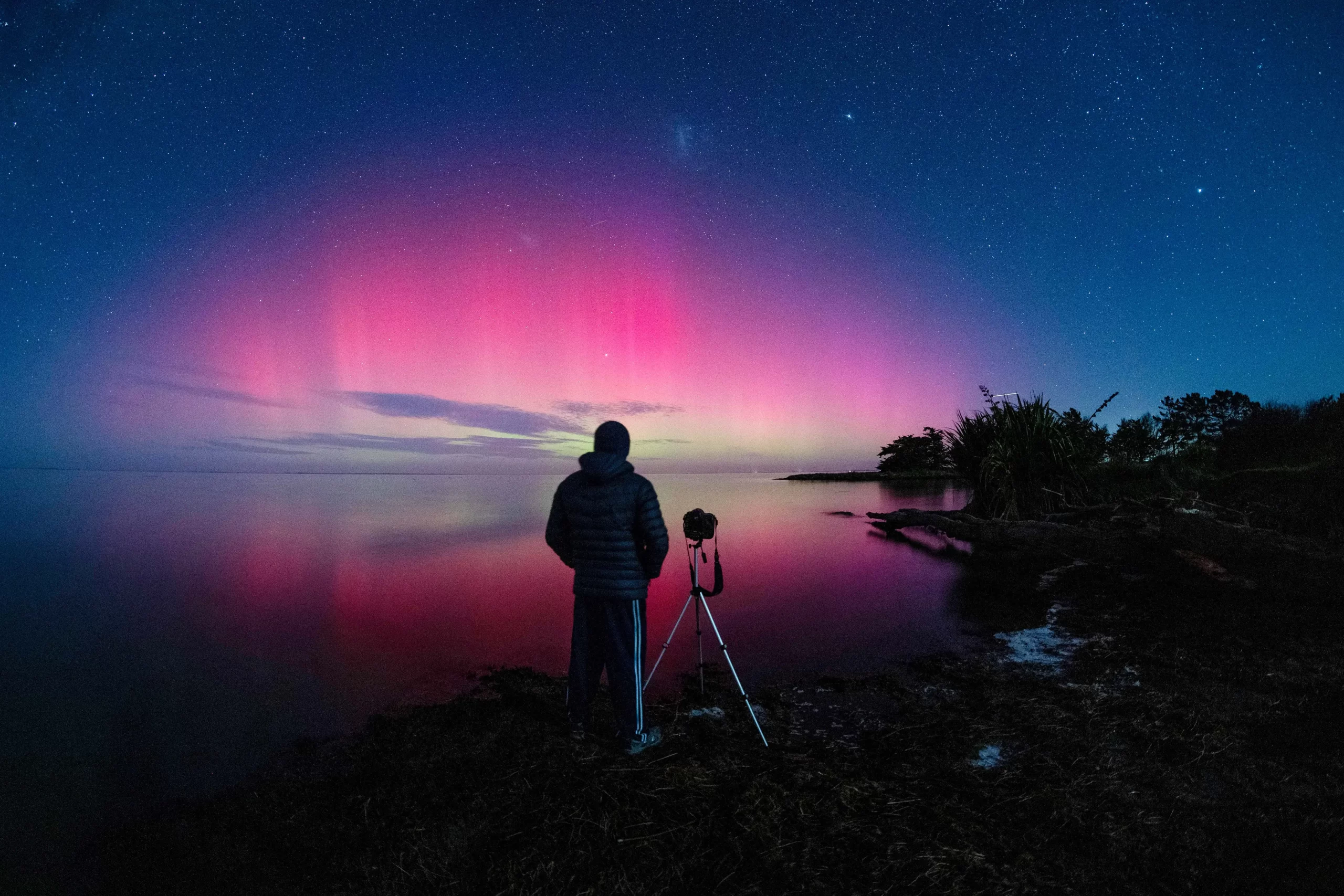 Muž pozoruje polární záři Aurora Australis, známou také jako jižní záře, která září na obzoru nad jezerem Ellesmere na předměstí Christchurch na Novém Zélandu 1. června 2025. Sanka Vidanagama/AFP via Getty Images