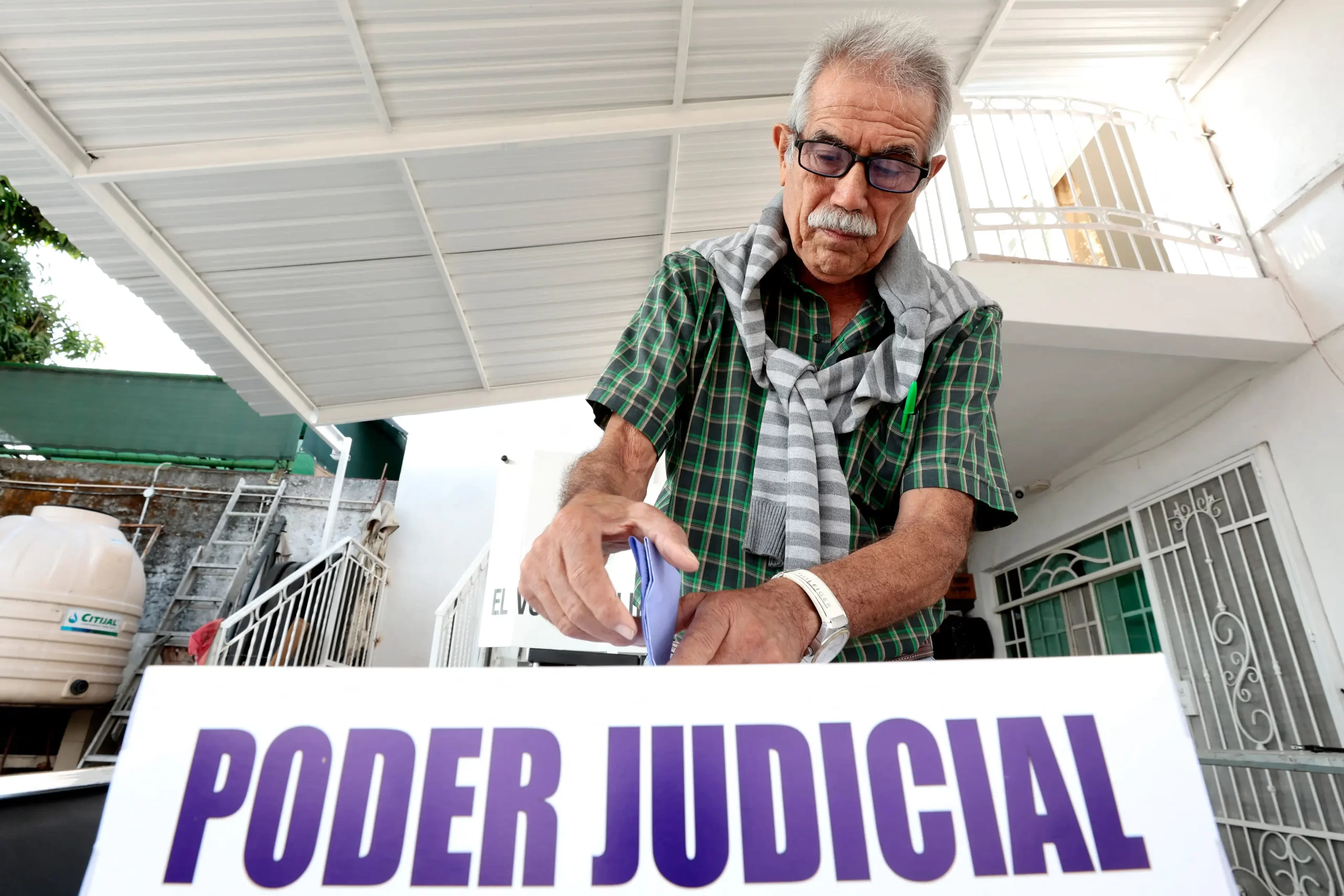 Muž odevzdává svůj hlas ve volební místnosti během prvních mexických voleb soudců a soudkyň v mexické Guadalajaře 1. června 2025. Volební místnosti byly otevřeny v neděli, čímž se Mexiko stalo jedinou zemí na světě, která vybírá své soudce na všech úrovních na základě lidového hlasování. Stringer/AFP via Getty Images