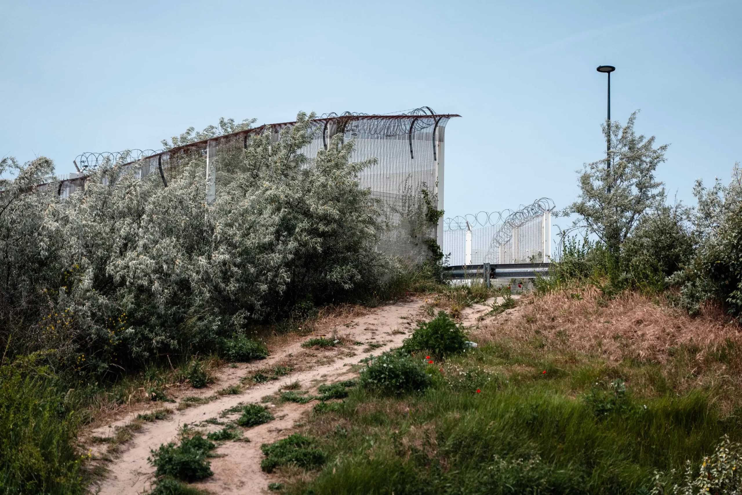 Plot ze žiletkového drátu lemuje silnici poblíž přístavů v Calais, aby chránil vozidla před pokusy černých pasažérů, kteří se snaží překonat kanál La Manche, v Calais ve Francii 1. června 2025. Počet migrantů, kteří překračují kanál La Manche na malých člunech, se oproti loňskému roku zvýšil zhruba o 40 procent. V dubnu bylo oznámeno, že Spojené království a Francie vedou jednání o potenciální dohodě o navracení migrantů, kteří překonávají kanál La Manche na člunech. Carl Court/Getty Images