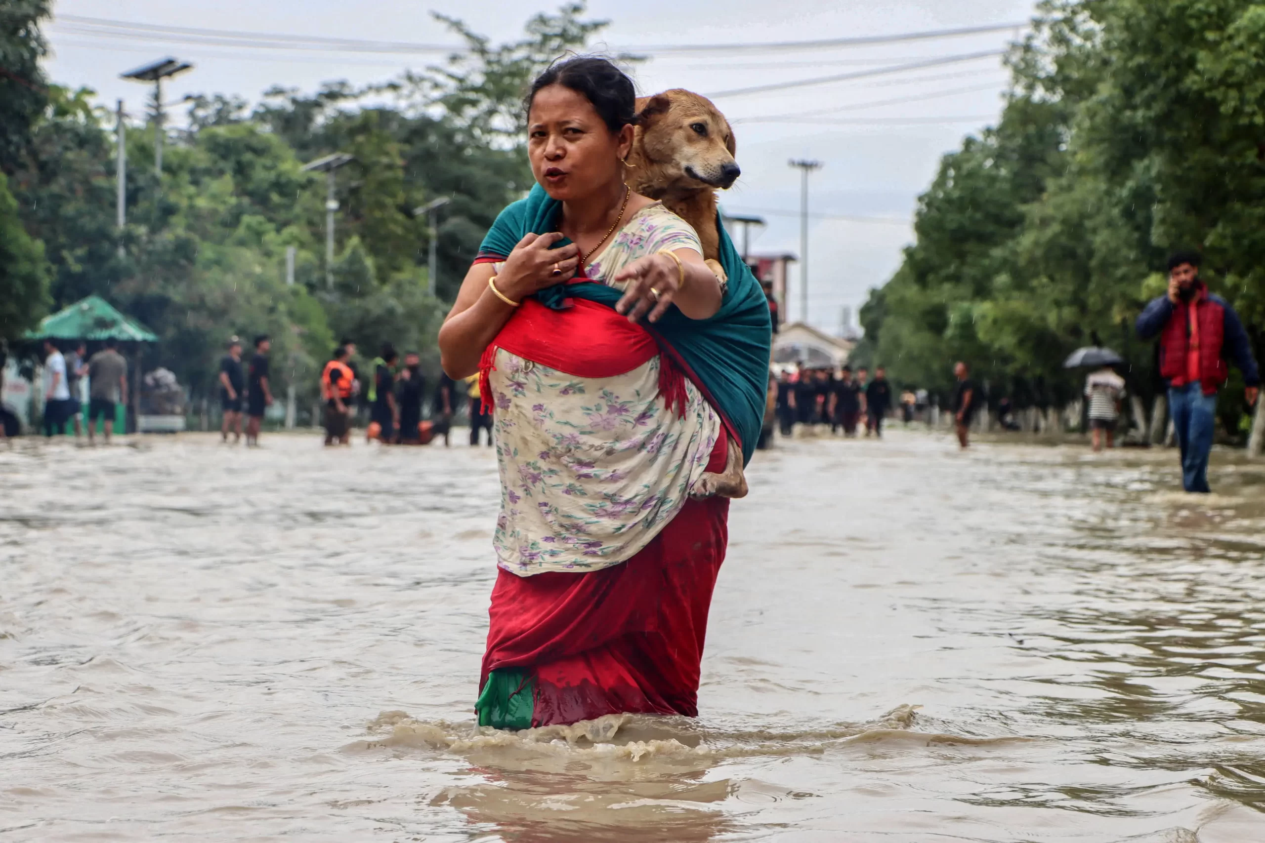 Žena nese svého psa a brodí se zaplavenou ulicí po silných deštích v Imphal East, okrese na severovýchodě indického státu Manipur, 1. června 2025. Přívalové záplavy a sesuvy půdy po přívalových monzunových deštích v posledních dvou dnech zabily nejméně 30 lidí, uvedly úřady 1. června. -/AFP prostřednictvím Getty Images