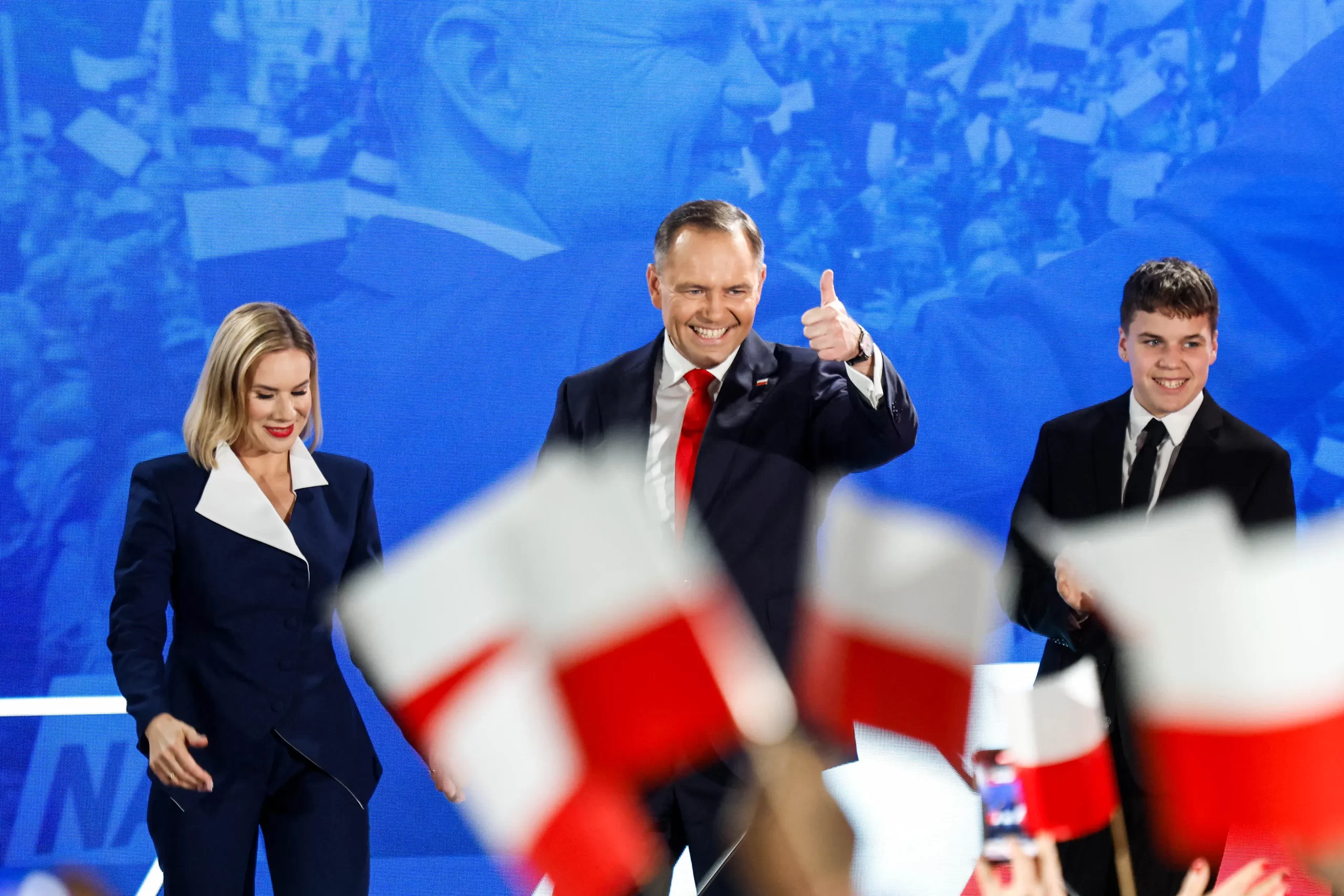 Karol Nawrocki, kandidát polské strany Právo a spravedlnost (PiS) pro prezidentské volby v roce 2025, reaguje vedle své manželky Marty na zveřejňování předběžných volebních výsledků během volební noci v divadle Mala Warszawa v polské Varšavě během druhého kola prezidentských voleb 1. června 2025. Soupeři v prezidentských volbách v Polsku se 1. června po druhém kole voleb v průzkumech při odchodu z volebních místností rozešli smírně. Wojtek Radwanski/AFP via Getty Images
