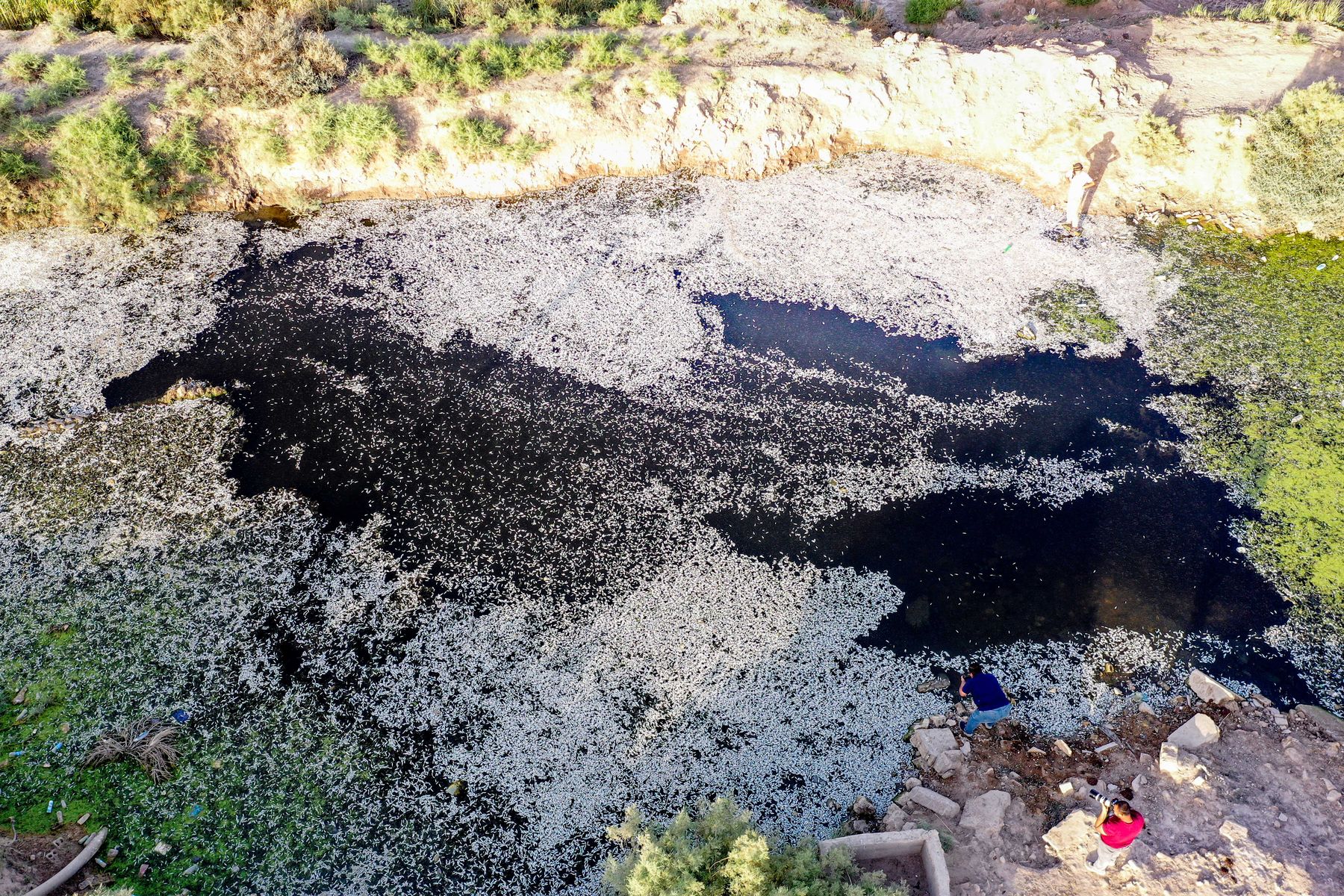 Ryby plavou na hladině vody během hromadného úhynu v bažině Ibn Najm v Iráku dne 1. června 2025. Qassem Al-Kaabi/AFP via Getty Images