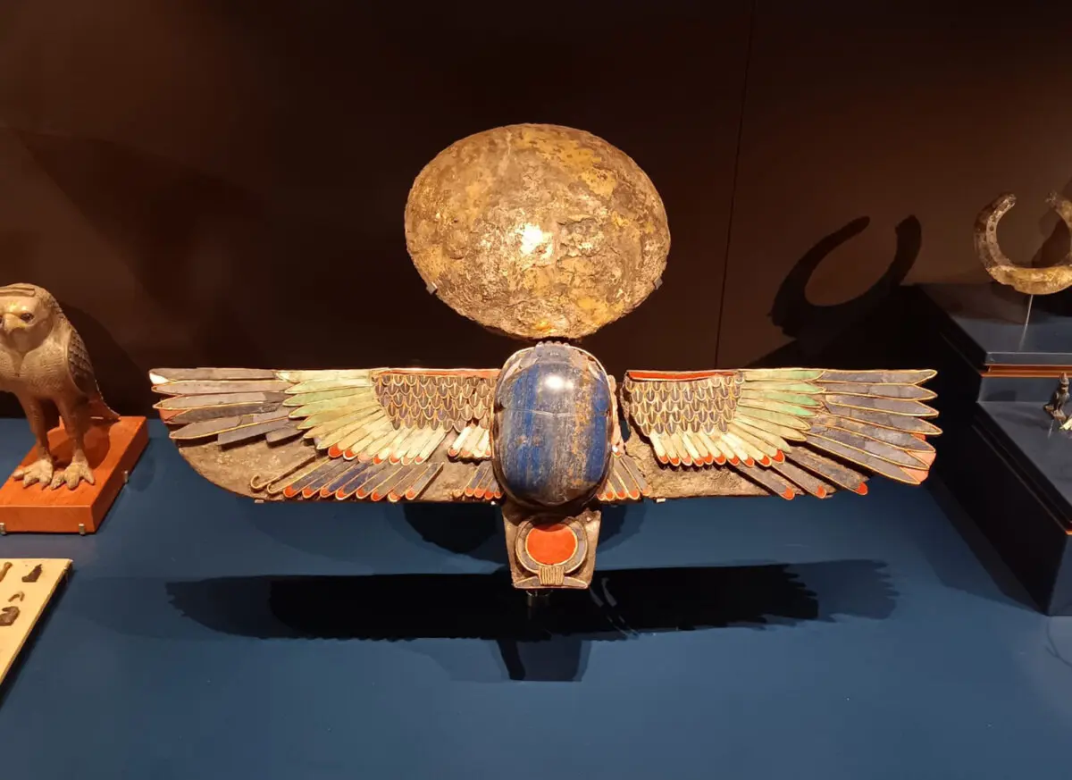 Zlatý skarabeus z lapisu lazuli v expozici Nové říše ve Velkém egyptském muzeu, 25. dubna 2025. (Autumn Spredemann / Epoch Times)