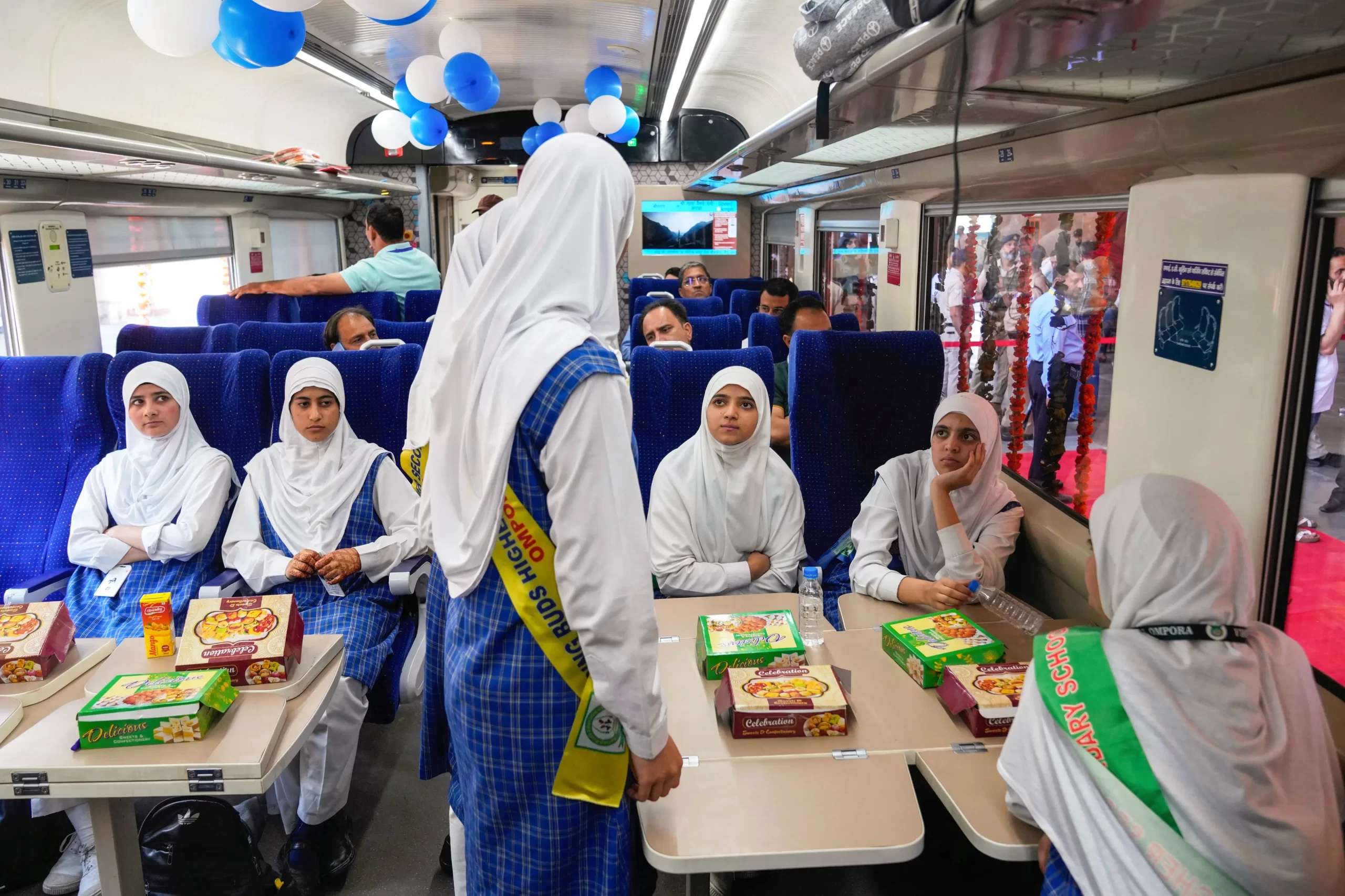 Cestující se občerstvují ve vlaku Vande Bharat Express, který má brzy začít jezdit mezi Šrínagarem a Katrou, ve Šrínagaru v Indií kontrolovaném Kašmíru 6. června 2025. Dar Yasin/AP Photo