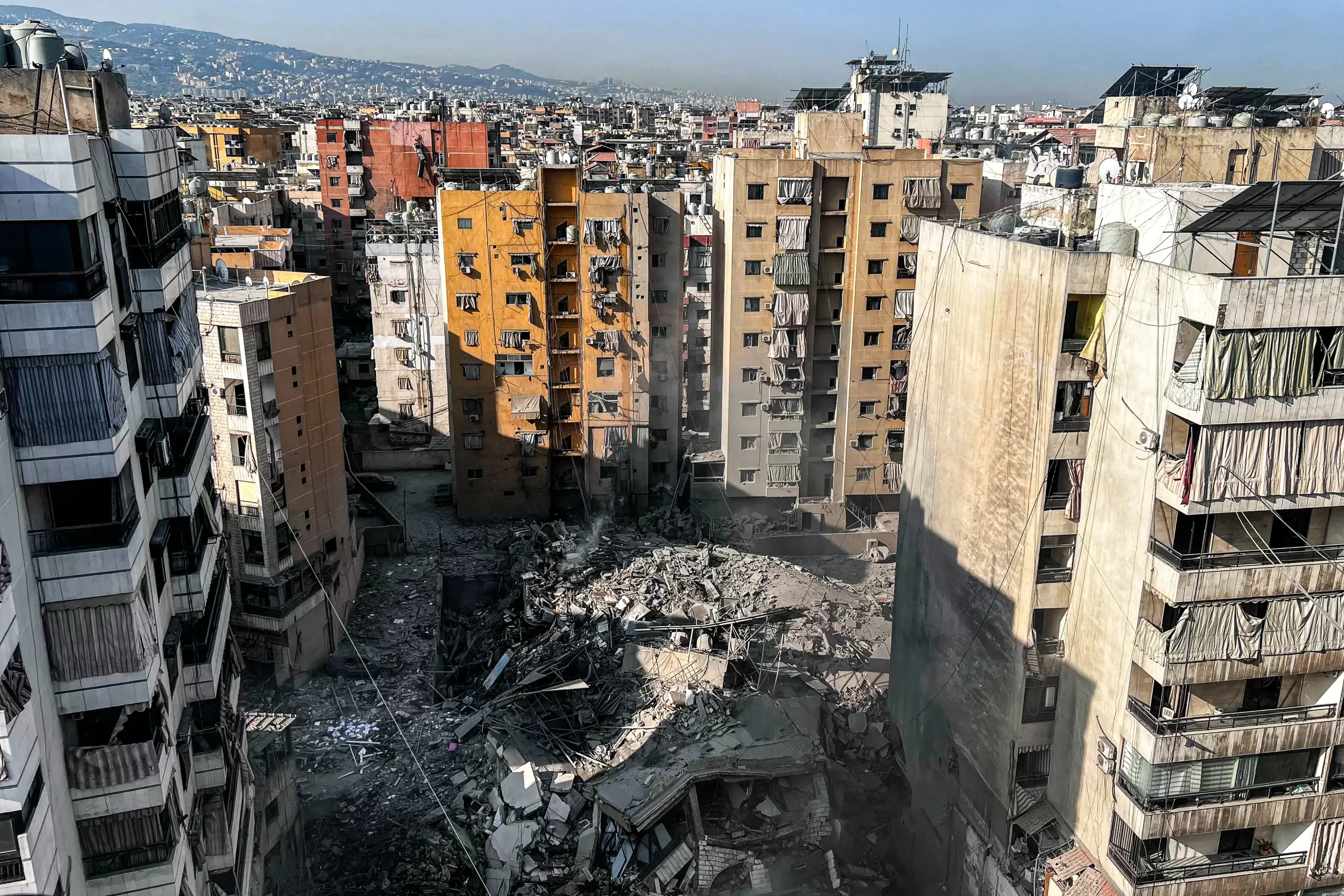 Trosky zřícené budovy zasažené nočním izraelským náletem ve čtvrti Qaem v libanonském Bejrútu 6. června 2025. Ibrahim Amro/AFP via Getty Images