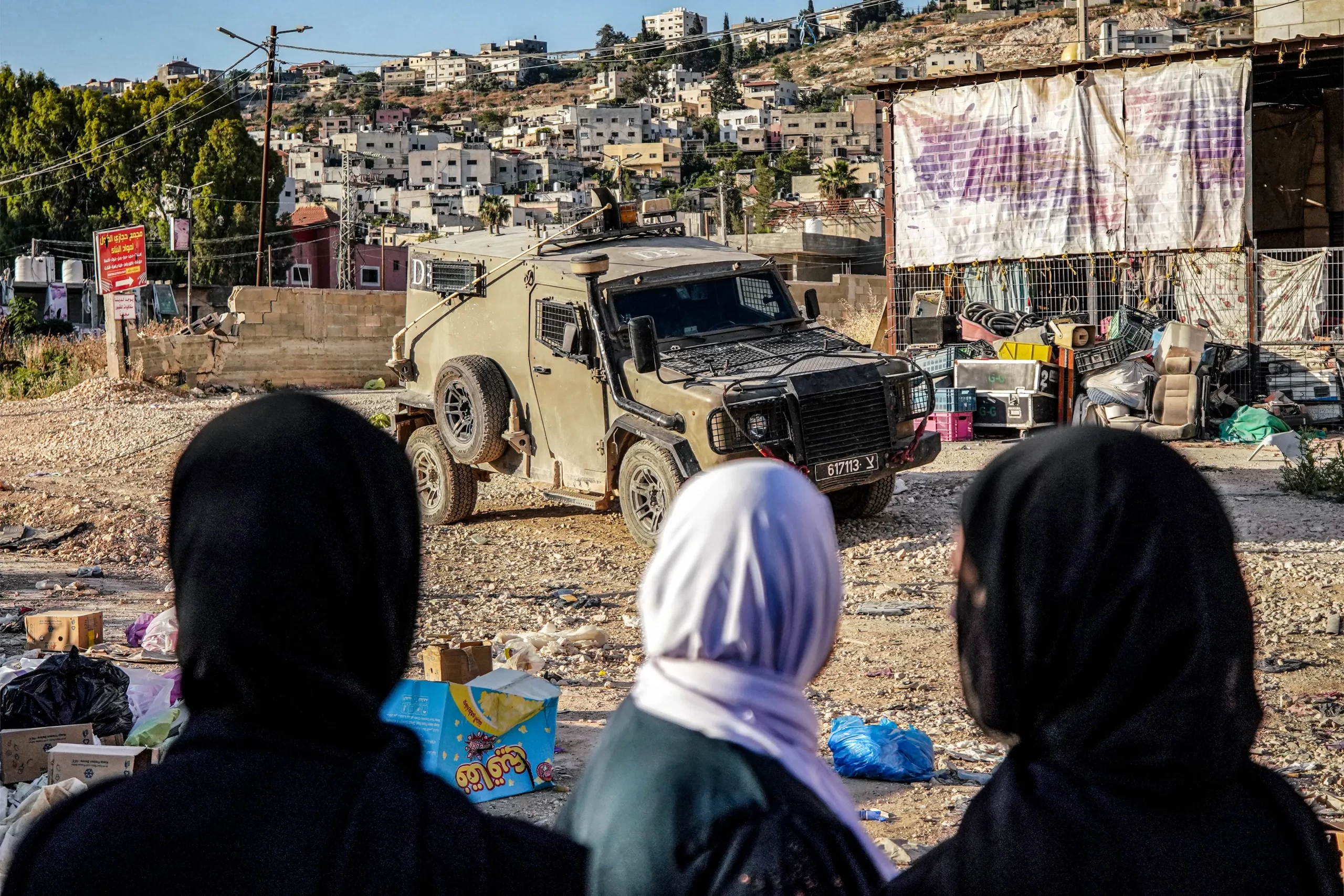 Ženy sledují příjezd obrněného vozidla izraelské armády na hřbitov v Jeninu na Západním břehu Jordánu 6. června 2025. AFP prostřednictvím Getty Images