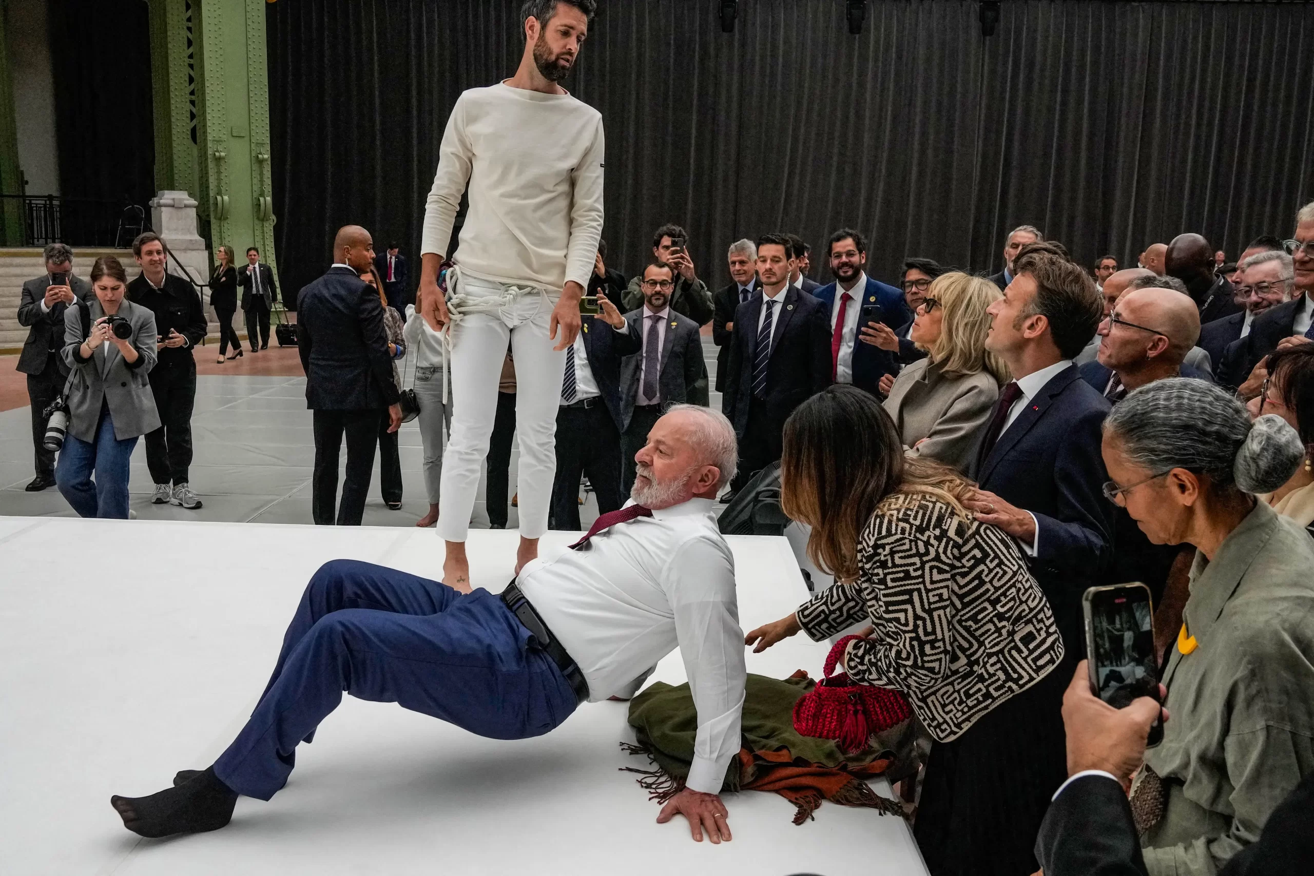 Brazilský prezident Luiz Inacio Lula da Silva se snaží zopakovat pohyb akrobatů během návštěvy výstavy v rámci své státní návštěvy v muzeu Grand Palais v Paříži 6. června 2025. Michel Euler/POOL/AFP via Getty Images