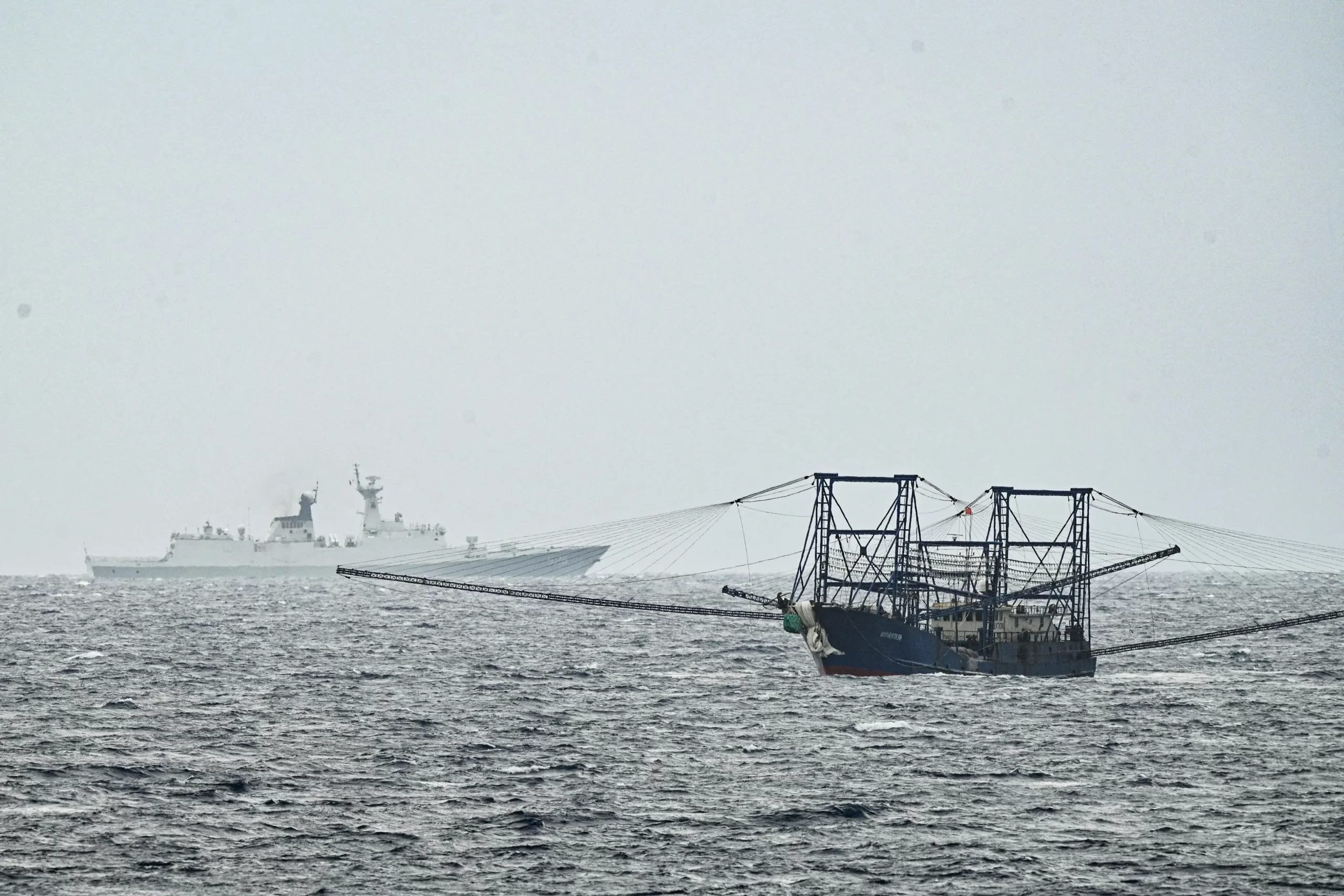Loď čínského námořnictva se znakem 525 na přídi proplouvá kolem čínského plavidla při pohledu z lodi filipínského námořnictva Andres Bonifacio poblíž Filipínami okupovaného ostrova Thitu během námořní hlídky ve sporném Jihočínském moři 6. června 2025. Ted Aljibe/AFP prostřednictvím Getty Images