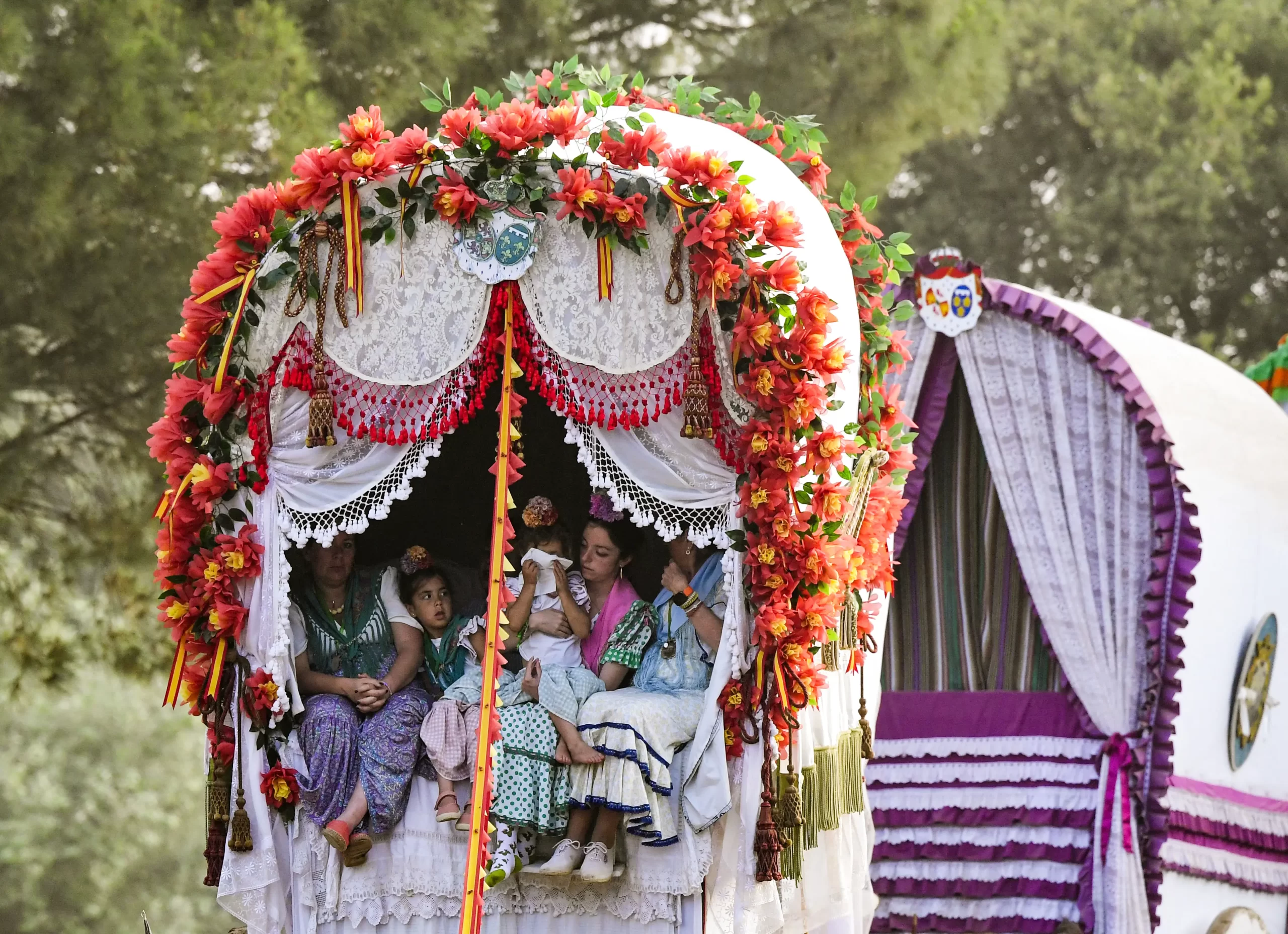 Poutníci z bratrstva Triana jedou v kočárech u řeky Quema ve Villamanrique během pouti na cestě do vesnice El Rocio ve Španělsku 6. června 2025. Statisíce věřících v tradičních krojích se sjíždějí v záplavě barev na pouti do El Rocio, když se na koních a na vyzdobených vozech vydávají na cestu andaluským venkovem. Cristina Quicler/AFP via Getty Images