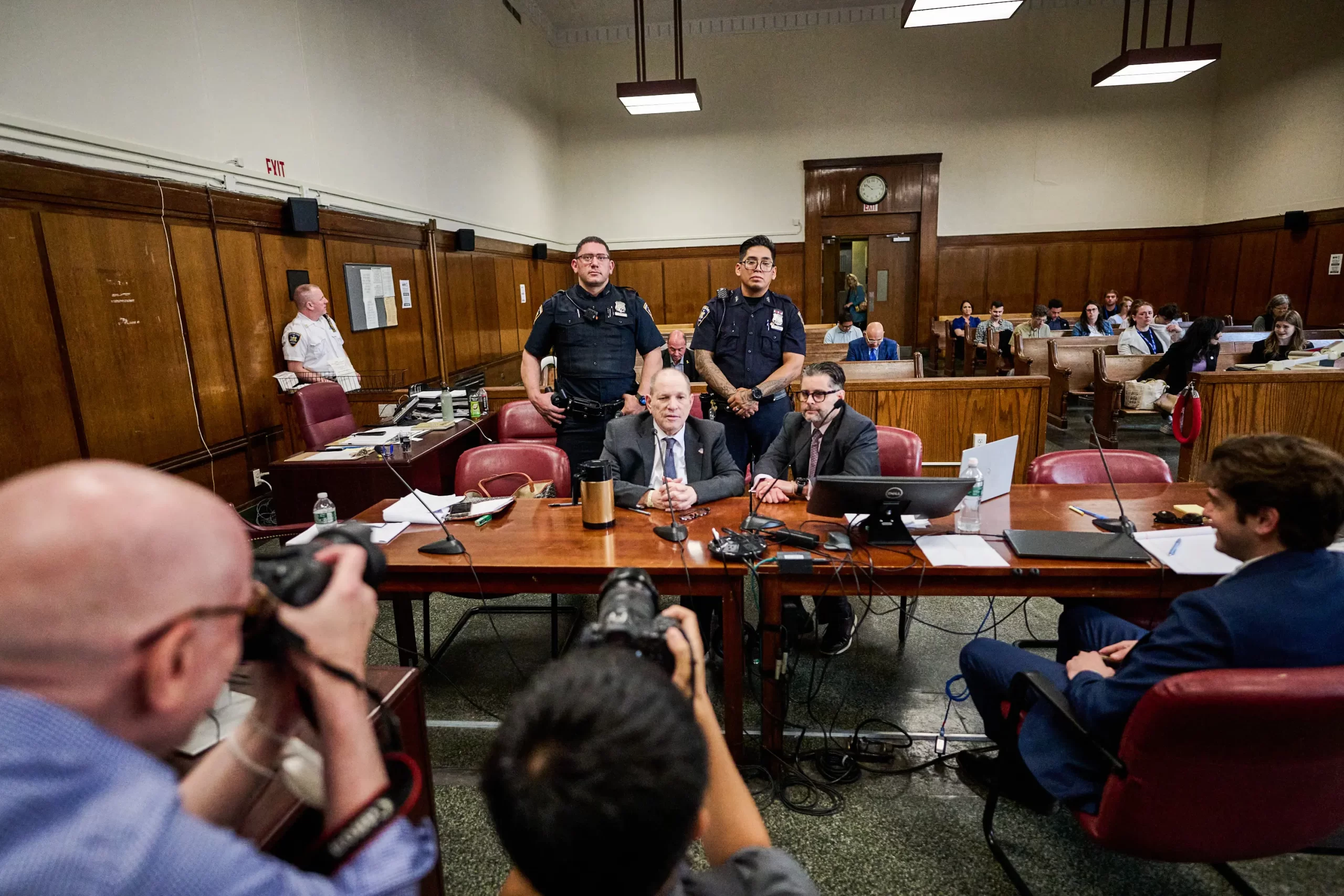 Bývalý filmový producent Harvey Weinstein (uprostřed) se dostavil k obnovenému soudnímu procesu u trestního soudu na Manhattanu v New Yorku dne 6. června 2025. Weinstein čelí opakovanému soudnímu procesu kvůli obvinění ze znásilnění a sexuálního napadení, za které byl předchozí rozsudek z roku 2017 zrušen odvolacím soudem, který rozhodl, že způsob jednání se svědky byl nezákonný. Curtis Means-Pool/Getty Images