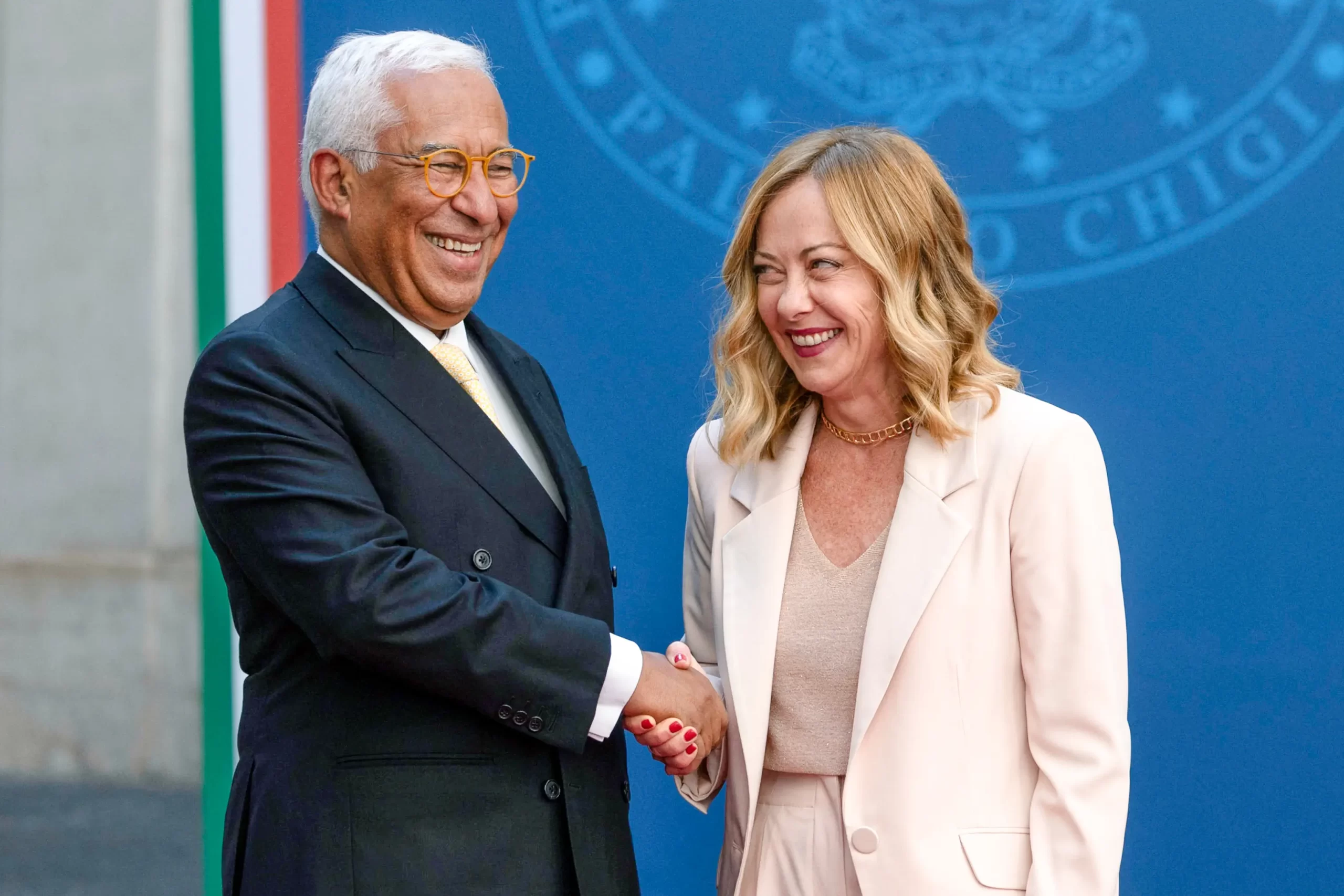 Italská premiérka Giorgia Meloni (vpravo) vítá předsedu Evropské rady Antonia Costu v paláci Chigi v Římě 6. června 2025 Massimo Percossi/ANSA/AFP via Getty Images