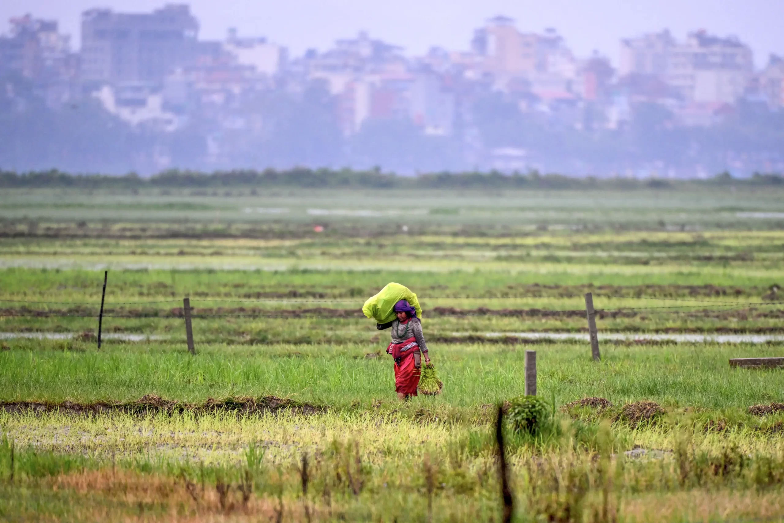 Farmářka se vrací domů z rýžového pole v nepálském městě Pokhara 6. června 2025. Prakash Mathema/AFP via Getty Images