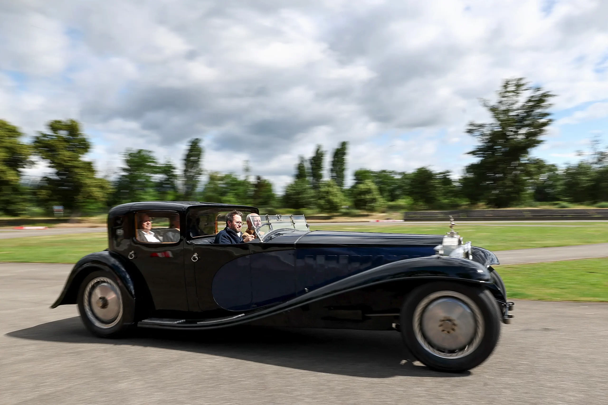 Mechanik dílny, který převáží hosty, řídí vůz Bugatti Royale Type 41 Coupe Napoleon na bioetanol na závodní dráze Národního automobilového muzea Schlumpf Collection v Mulhouse ve východní Francii 6. června 2025. Je mu téměř 100 let, jasně září, ale obvykle zhltne na 100 kilometrů kolem 50 litrů. Frederick Florin/AFP via Getty Images