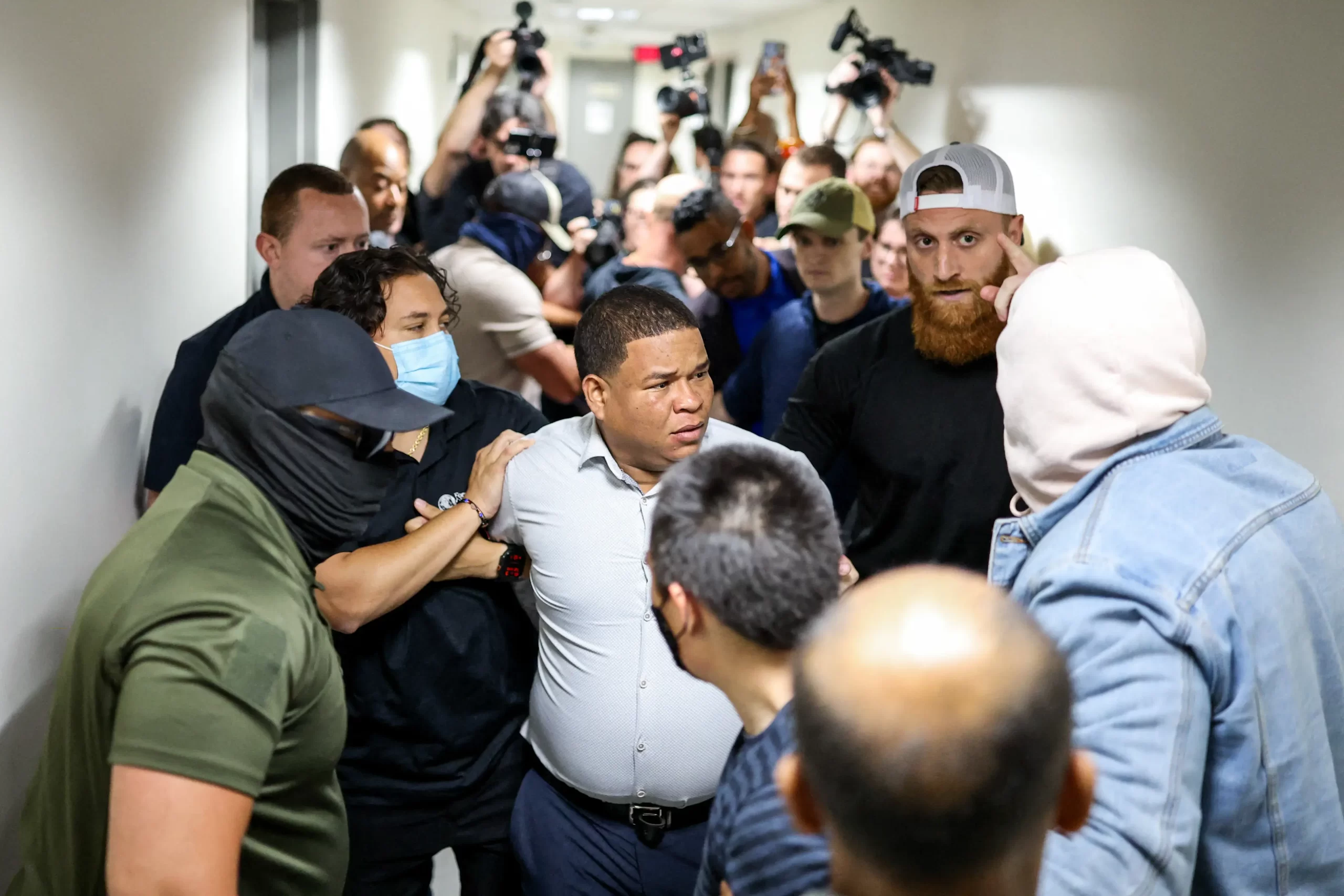Muž je zadržen policisty v civilu z Imigračního a celního úřadu (ICE) po soudním jednání na chodbě před soudní síní u imigračního soudu New York-Federal Plaza v budově Jacob K. Javitz Federal Building v New Yorku 6. června 2025. Soud spadá do pravomoci Výkonného úřadu pro imigrační kontrolu, který je dílčí agenturou amerického ministerstva spravedlnosti. Charly Triballeau/AFP via Getty Images