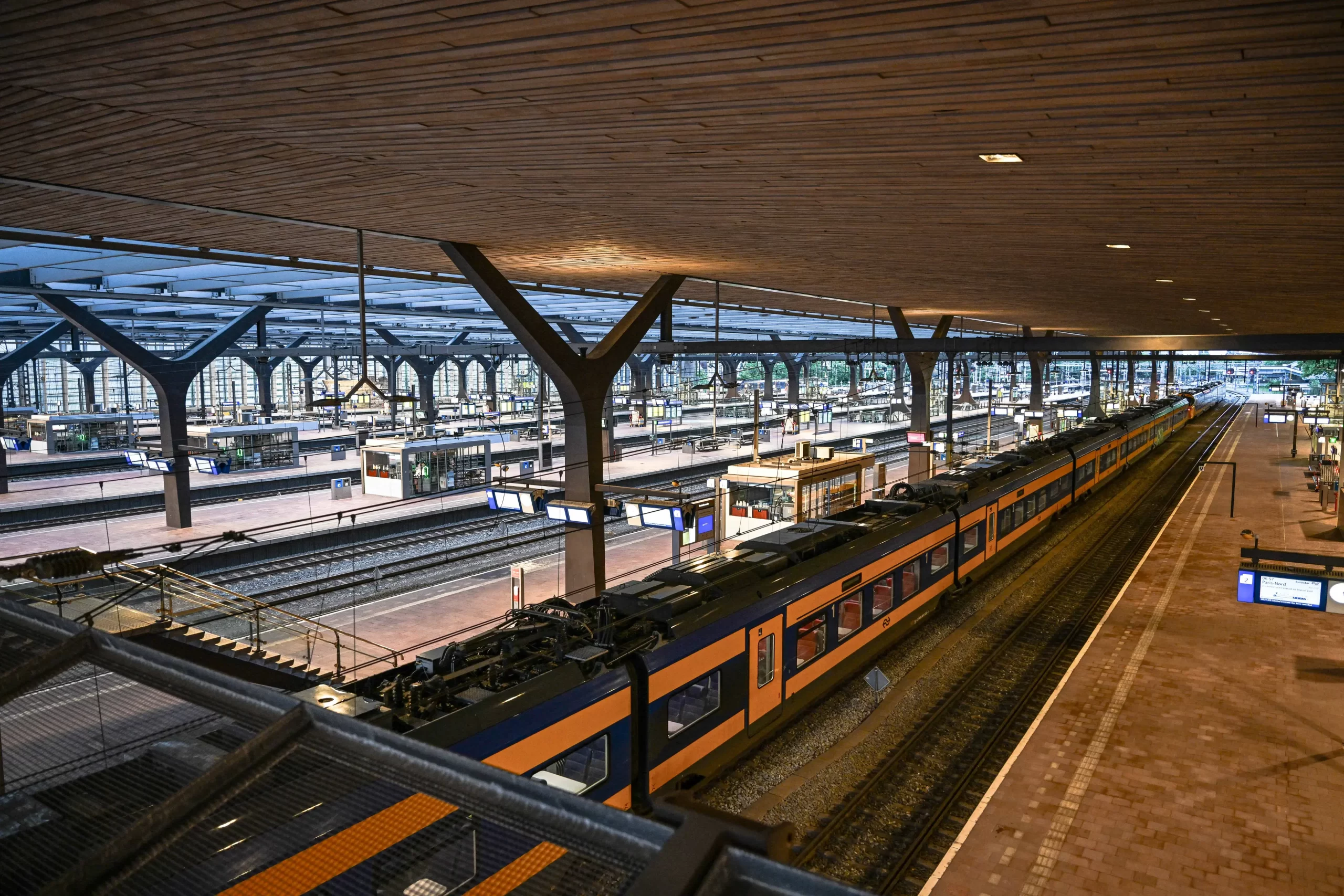 Prázdné vlakové nádraží poté, co 6. června 2025 ve čtyři hodiny ráno začala celostátní stávka vlaků NS, která zastavila téměř všechny spoje v nizozemském Rotterdamu. Odborový svaz FNV odmítl zvýšení platu o 2,55 % a označil ho za příliš nízké v podmínkách vysoké inflace. Mouneb Taim/Middle East Images/AFP prostřednictvím Getty Images