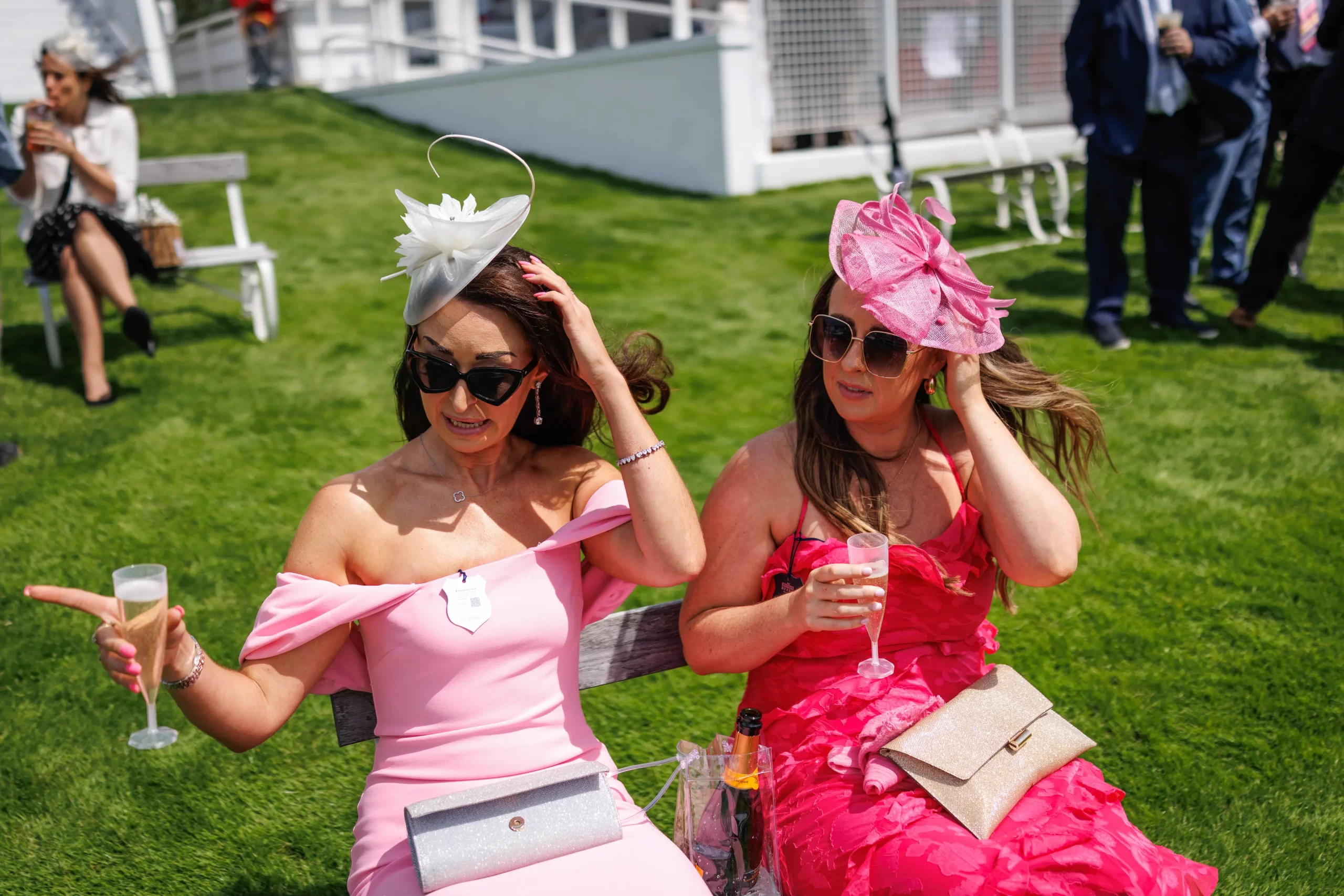 Návštěvnice dostihů si drží klobouky a sklenky šampaňského během Dámského dne na Epsom Derby Festivalu 2025 na závodišti Epsom Downs v anglickém Epsomu 6. června 2025. Dan Kitwood/Getty Images
