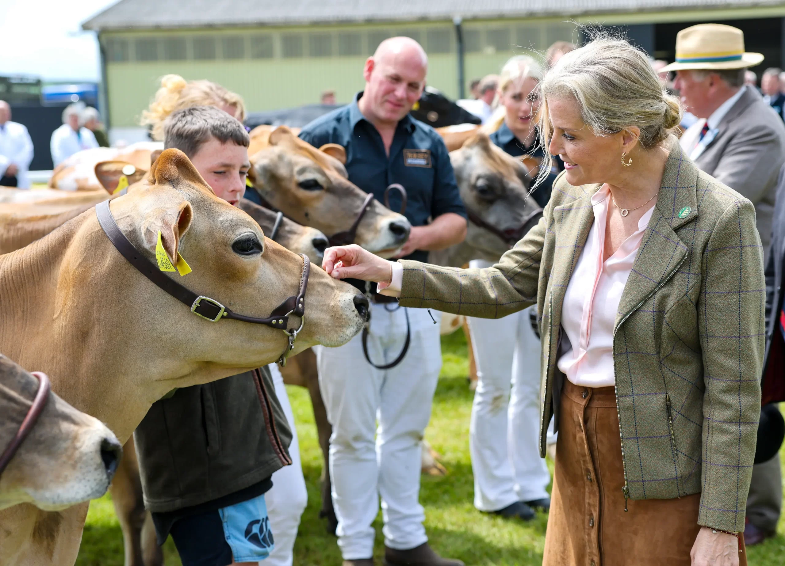 Sophie, vévodkyně z Edinburghu (vpravo), hladí krávu při prohlídce dobytka, prasat, ovcí a venkova během Royal Cornwall Show na výstavišti Royal Cornwall Showground ve Wadebridge v Anglii 6. června 2025. Chris Jackson/Getty Images