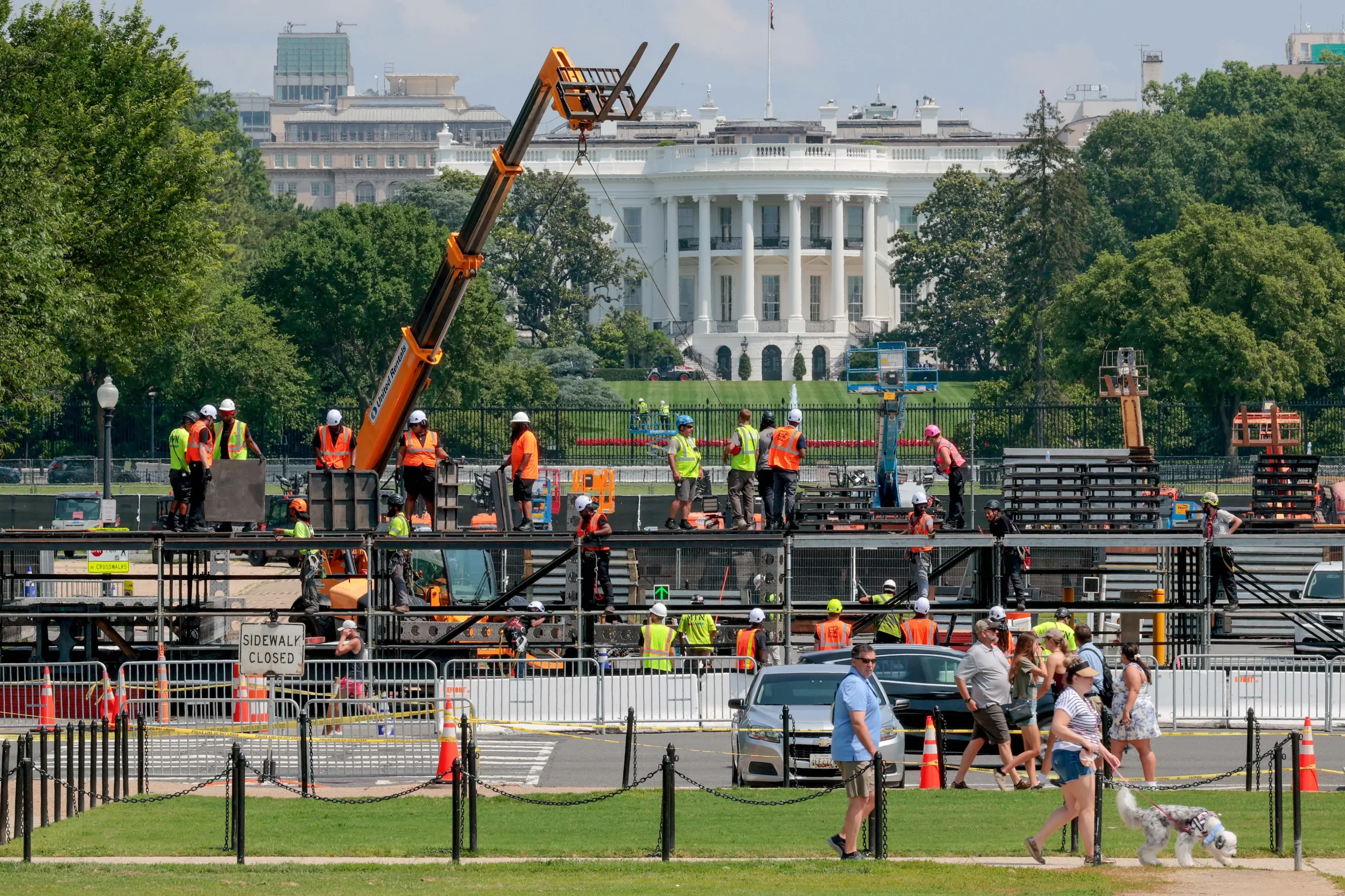 Prezidentská tribuna je postavena 6. června 2025 na Constitution Avenue NW, na Ellipse jižně od Bílého domu. Americká armáda oslaví 250. výročí svého vzniku přehlídkou po National Mall, které se zúčastní 6 500 vojáků, 150 vozidel a 50 letadel. Chip Somodevilla/Getty Images