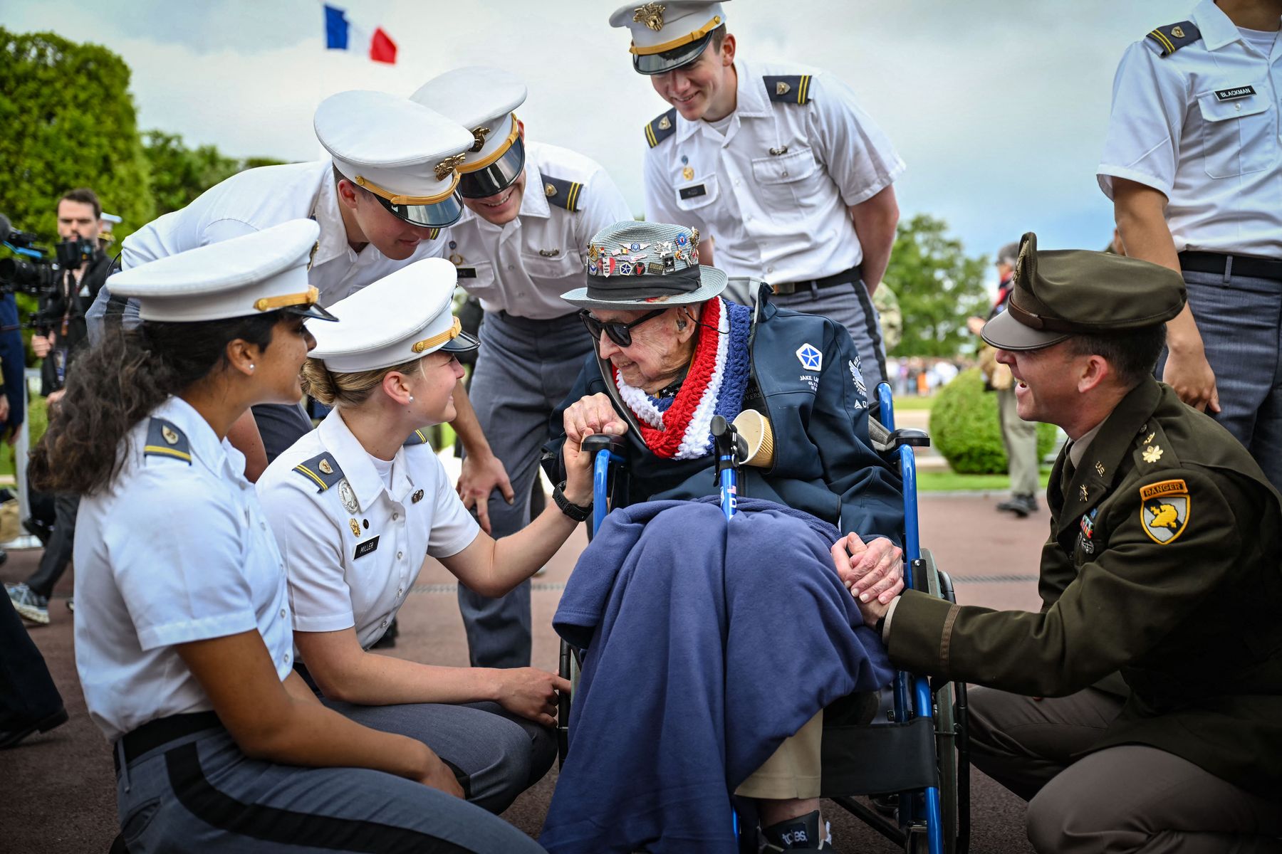 Účastníci se smějí se 102letým americkým veteránem z druhé světové války a účastníkem vylodění v Den D Jakem Larsonem, známým také jako „Papa Jake“, před vzpomínkovým ceremoniálem, který se konal v rámci 81. výročí vylodění spojenců v Normandii v Den D na americkém hřbitově v Colleville-sur-Mer v severozápadní Francii 6. června 2025. Lou Benoist/AFP via Getty Images