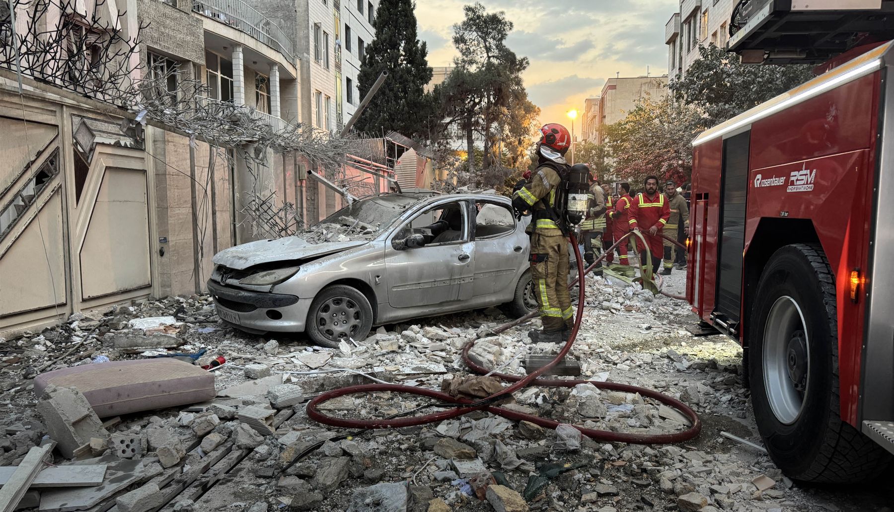 Záchranáři se shromažďují u budovy, která byla zasažena izraelským úderem v íránském Teheránu dne 13. června 2025. Izrael 13. června zasáhl v Íránu přibližně 100 cílů, včetně jaderných zařízení a vojenských velitelských center, a zabil vysoce postavené osoby včetně velitele ozbrojených sil a špičkových jaderných vědců. Meghdad Madadi/TASNIM NEWS/AFP prostřednictvím Getty Images
