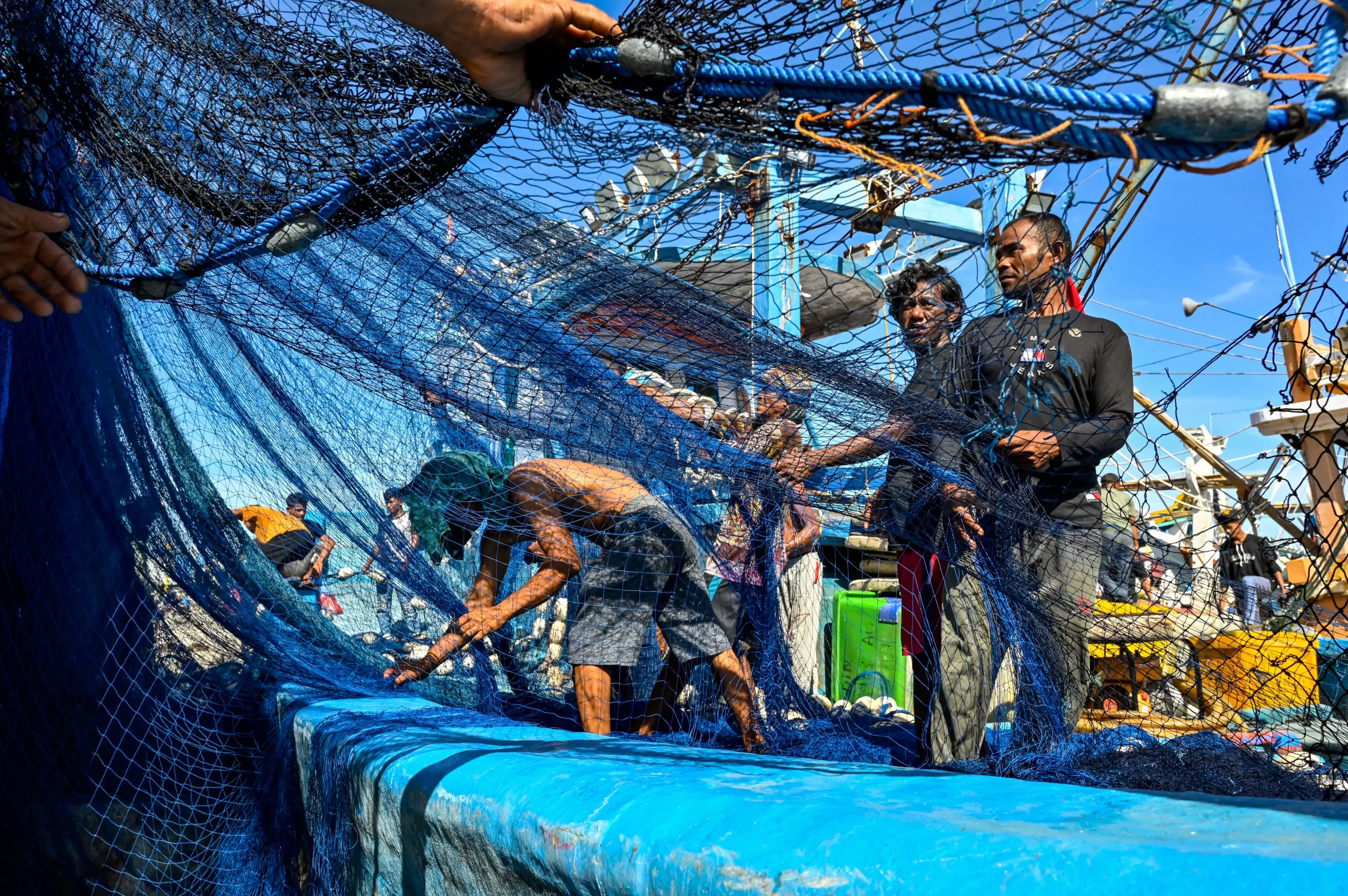 Rybáři nakládají sítě na loď v přístavu v indonéském Banda Acehu 13. června 2025. Chaideer Mahyuddin/AFP via Getty Images